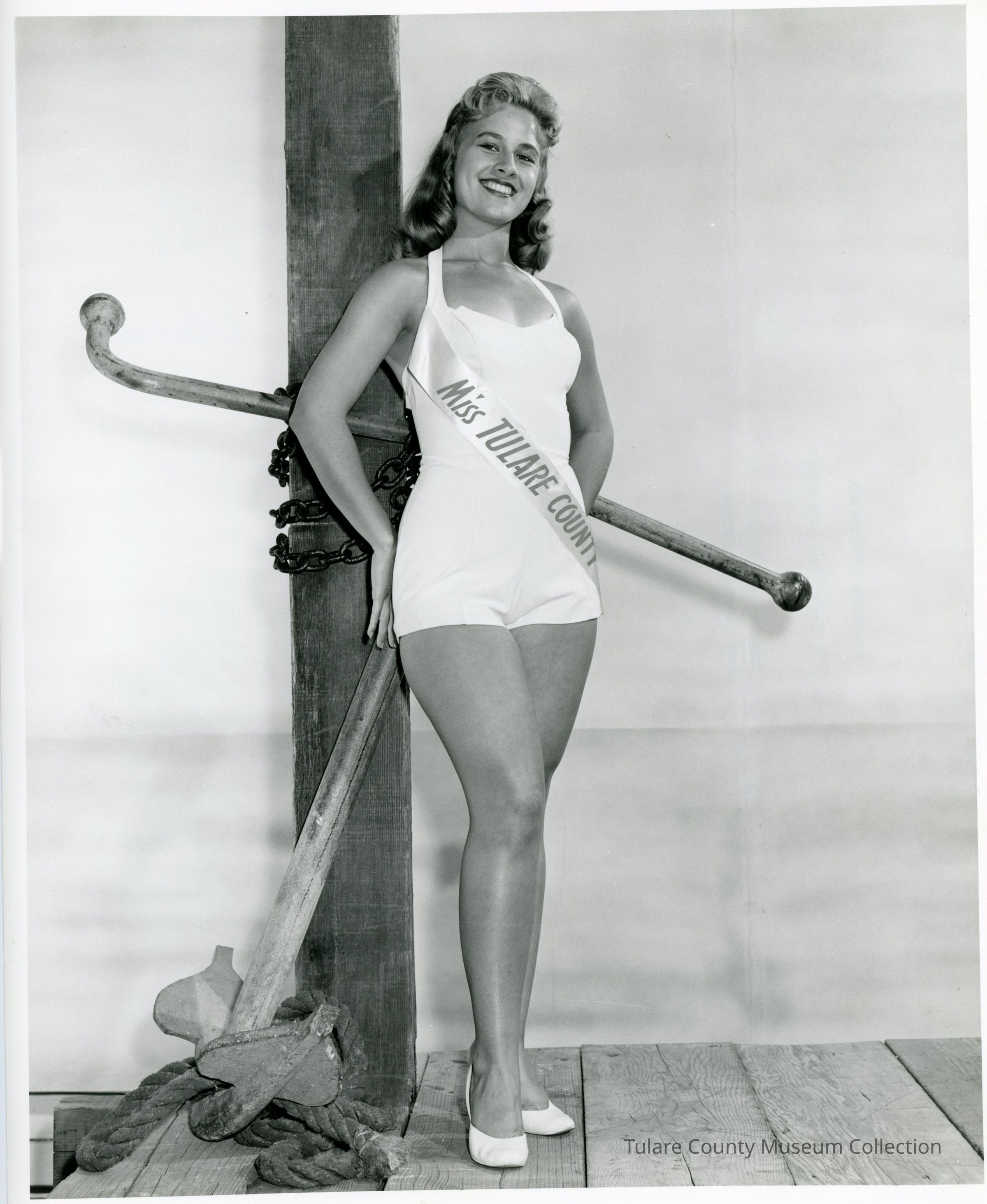 Professional portrait of a young woman in a bathing suit posing against a large wooden pole with an anchor strapped to it. Attached to her bathing suit is a Miss Tulare County sash. Her curled hair is half pinned up. Her hands are placed behind her back as she stands contrapposto. She looks into the camera and smiles.Lexicon