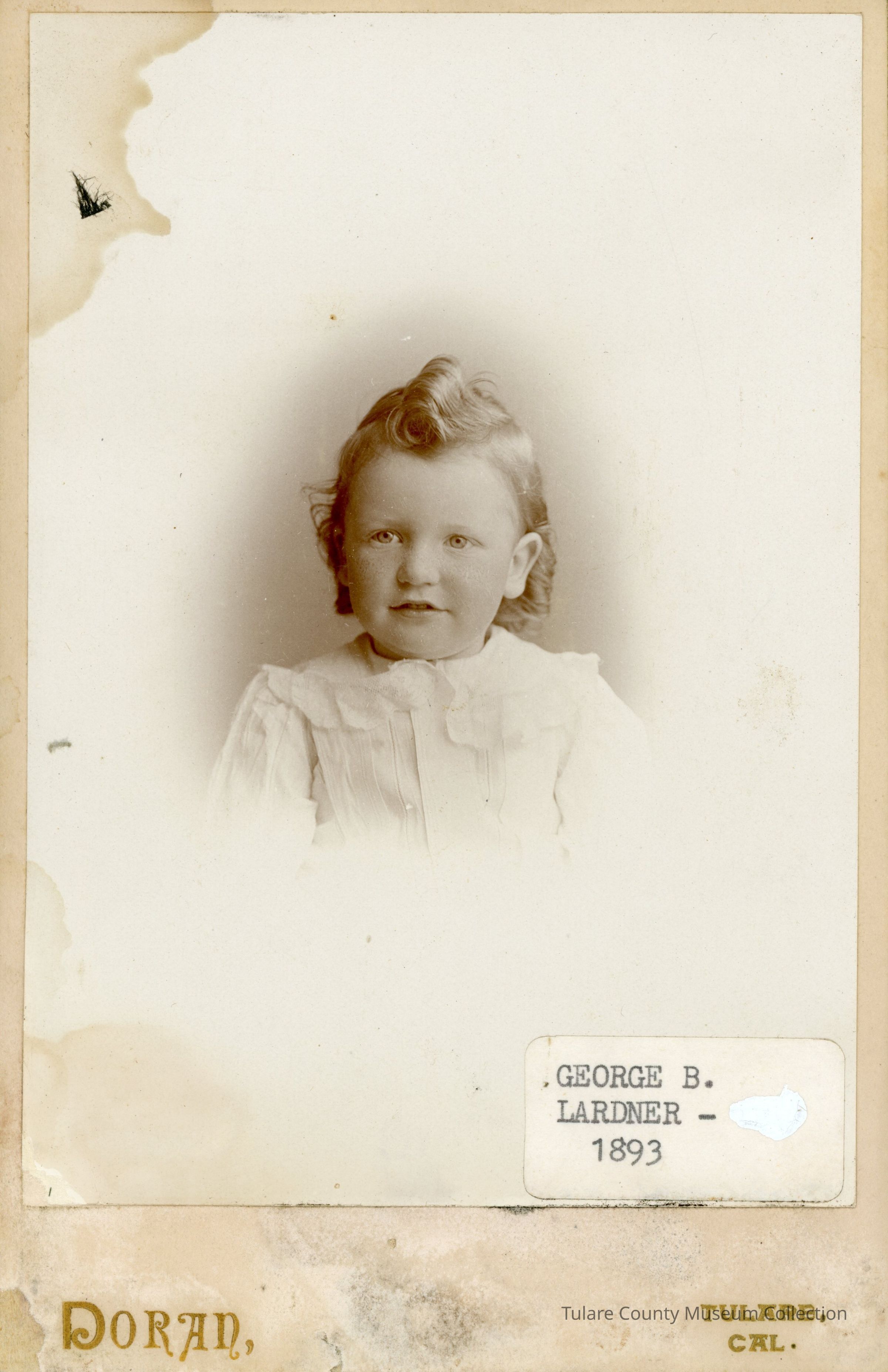 (1) Black and white photo of a young boy wearing a ruffled long sleeve shirt. The top of the boy's hair is curled. The child is Identified as George B. Lardner.