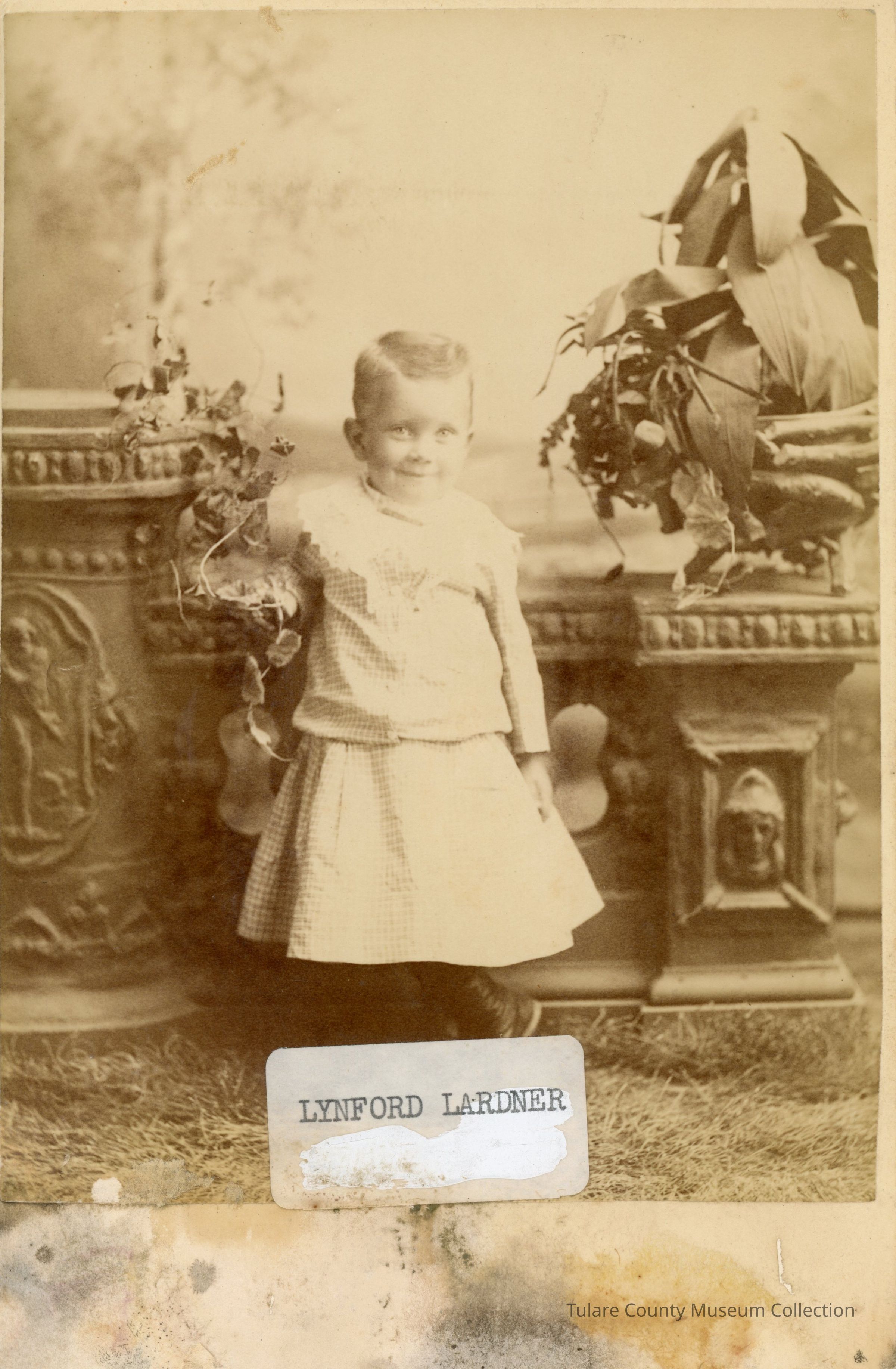 (1) Picture of A young boy dressed in a long sleeve shirt and long skirt with crossed legs leans against a pedestal. The boy has parted hair and a big smile. The young boy is identified as Lynford Lardner
