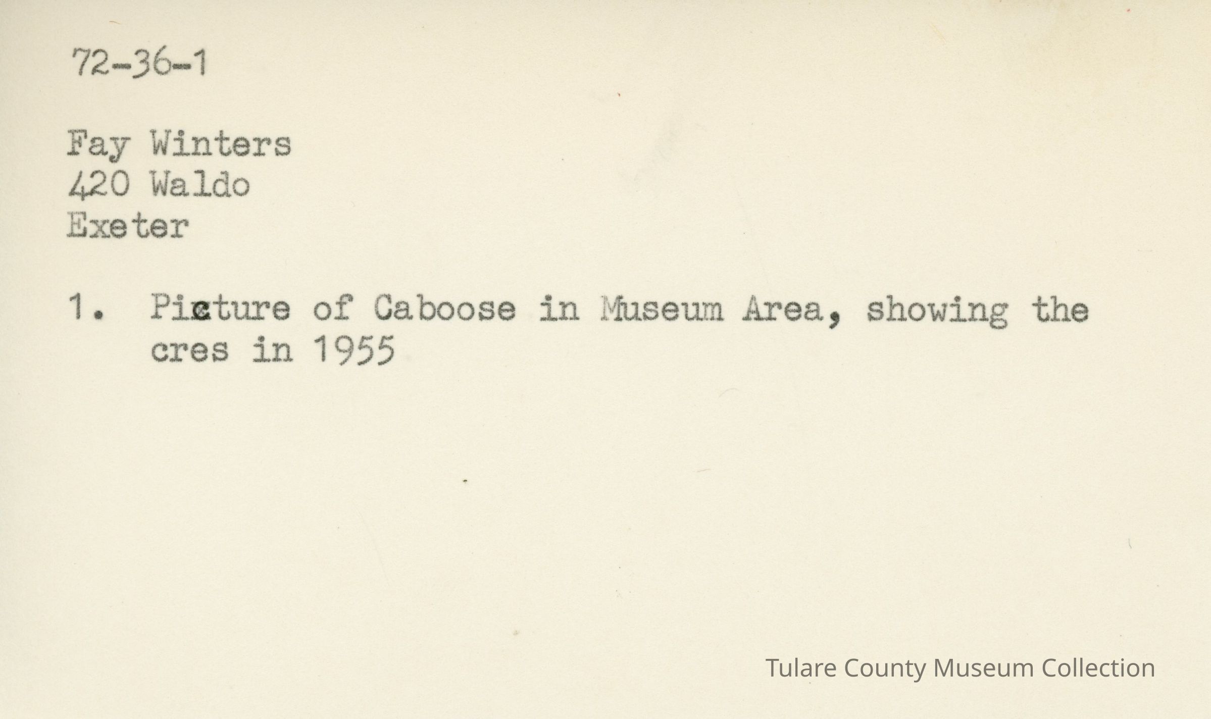 Picture of Caboose in Museum Area, showing the crew in 1955. From left to right: Don McFadzean- Brakeman, Fay Winters- Brakeman, Lisle Ainsworth- conductor, John Card- engineer. Caboose now on display in the Tulare County Museum Pioneer Village.