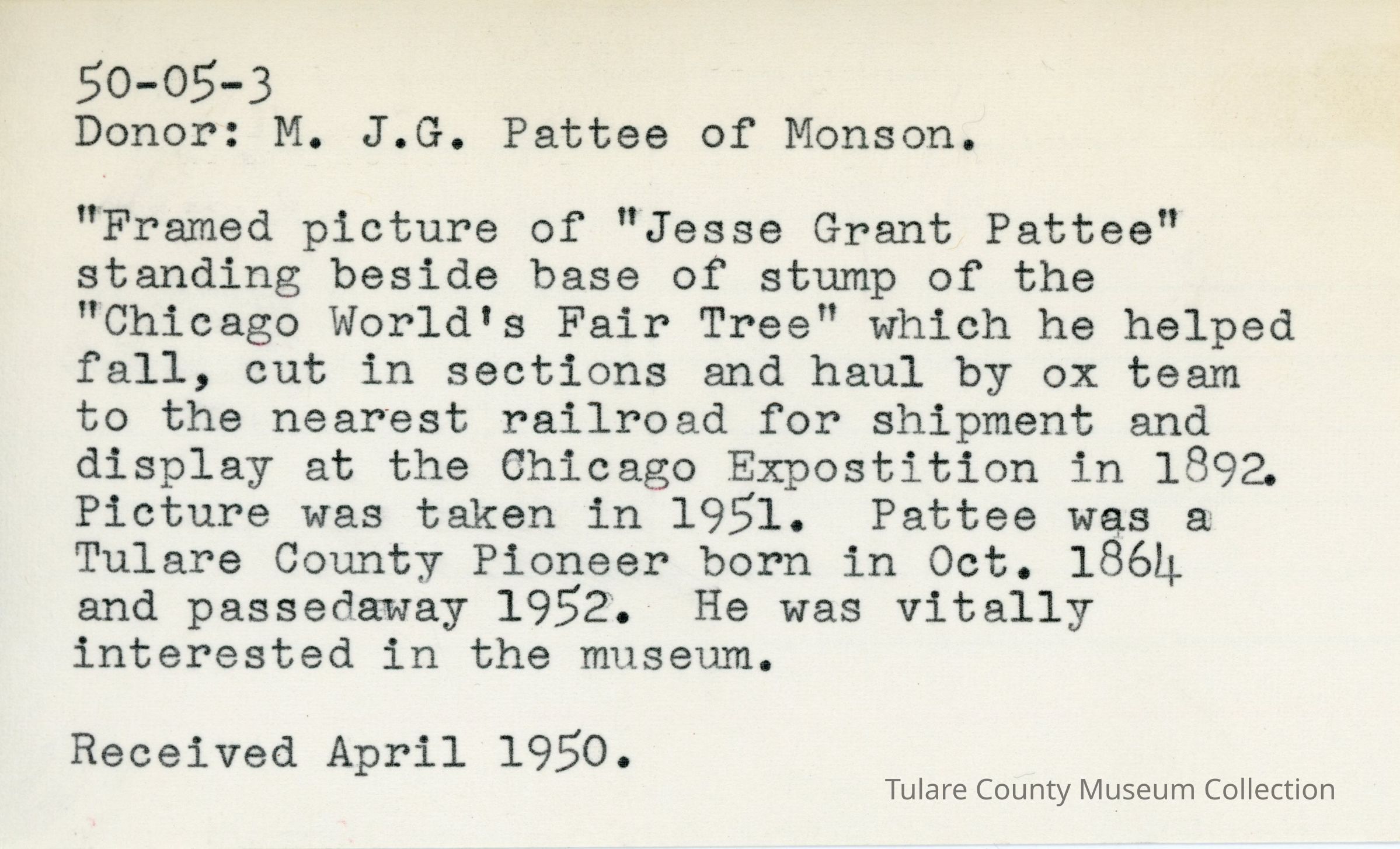 Framed picture of "Jesse Grant Pattee" standing beside base of stump of the "Chicago World's Fair Tree" which he helped fall, cut in sections and haul by ox team to the nearest railroad for shipment and display at the Chicago Exposition in 1892.Lexicon