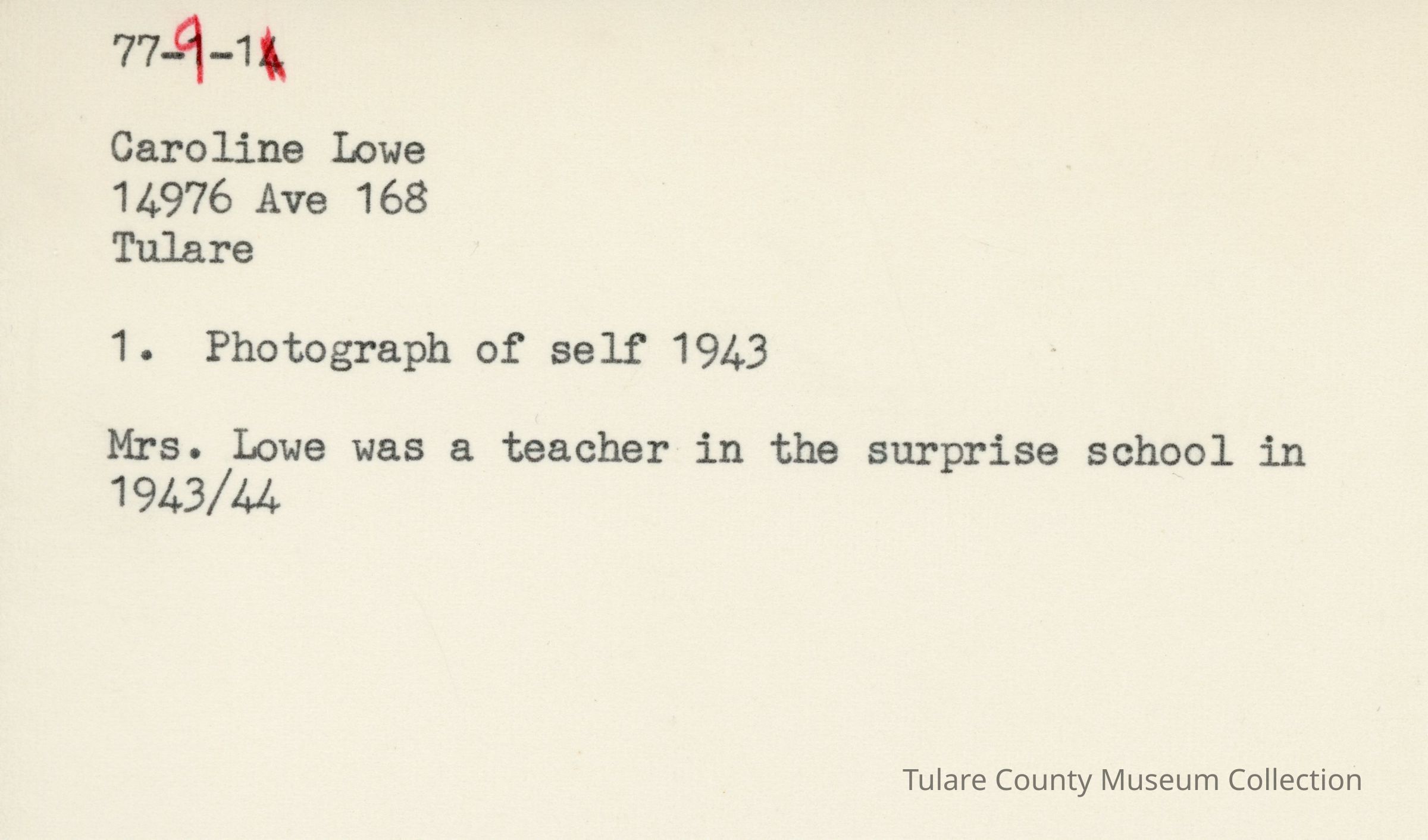 Photograph of Caroline Lowe 1943. Mrs. Lowe was a teacher in the Surprise School in 1943/44.