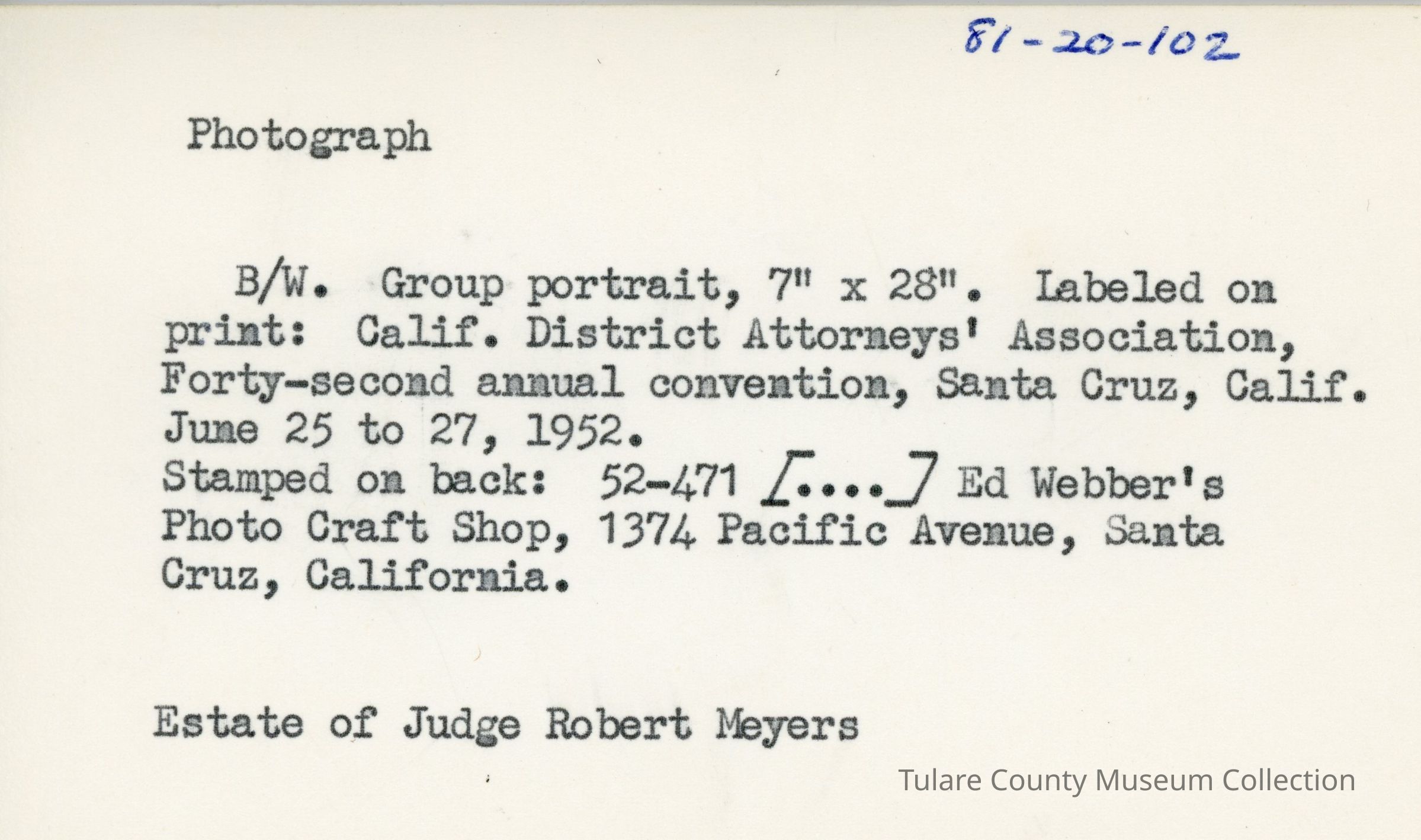 B/W Group portrait 7" x 28" labeled on print: Calif. District Attorneys' Association, Forty-second annual convention, Santa Cruz, Calif. June 25 to 27, 1952. Stamped on back: 52-471 [...] Ed Webber's Photo Craft Shop, 1374 Pacific Avenue, Santa Cruz, California.Lexicon