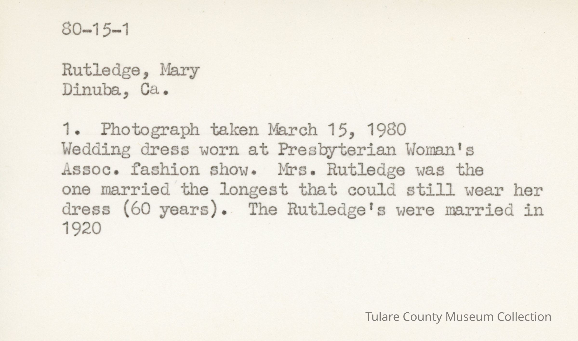Photograph taken March 15, 1980 wedding dress worn at Presbyterian Woman's Assoc. fashion show. Mrs. Rutledge was the one married the longest that could still wear her dress (60 years). The Rutledge's were married in 1920.Lexicon