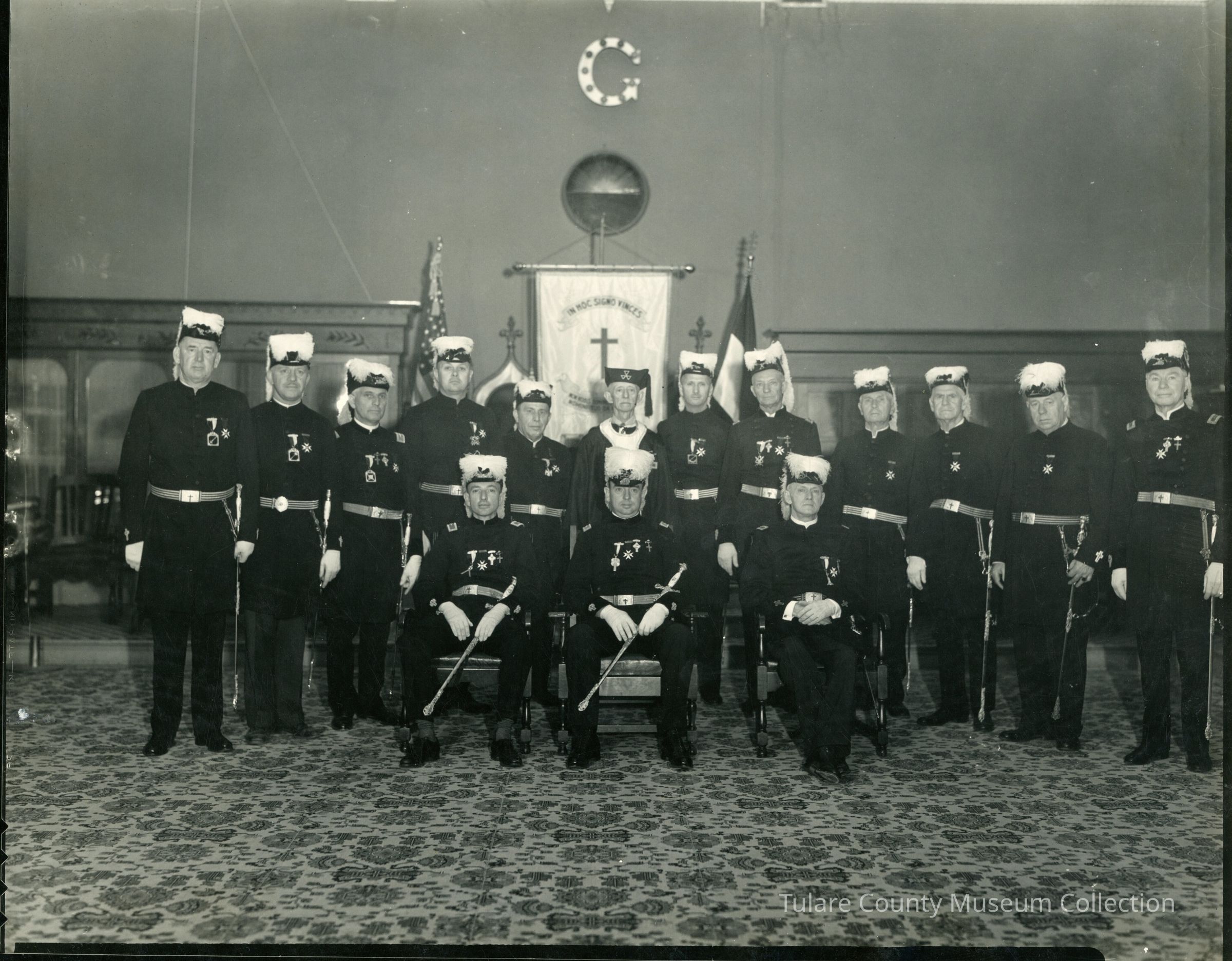 Group of 15 men dressed in full uniform divided into two rows. Three men are seated in the first row, the remaining 12 men stand in a line behind seated men.
