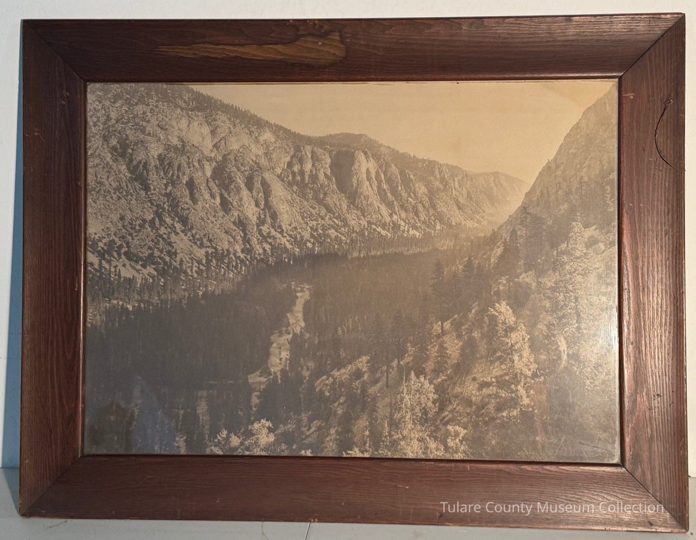 Brown Frame. Black and white, birds eye view, mountains range and a valley below with a small stream running down.