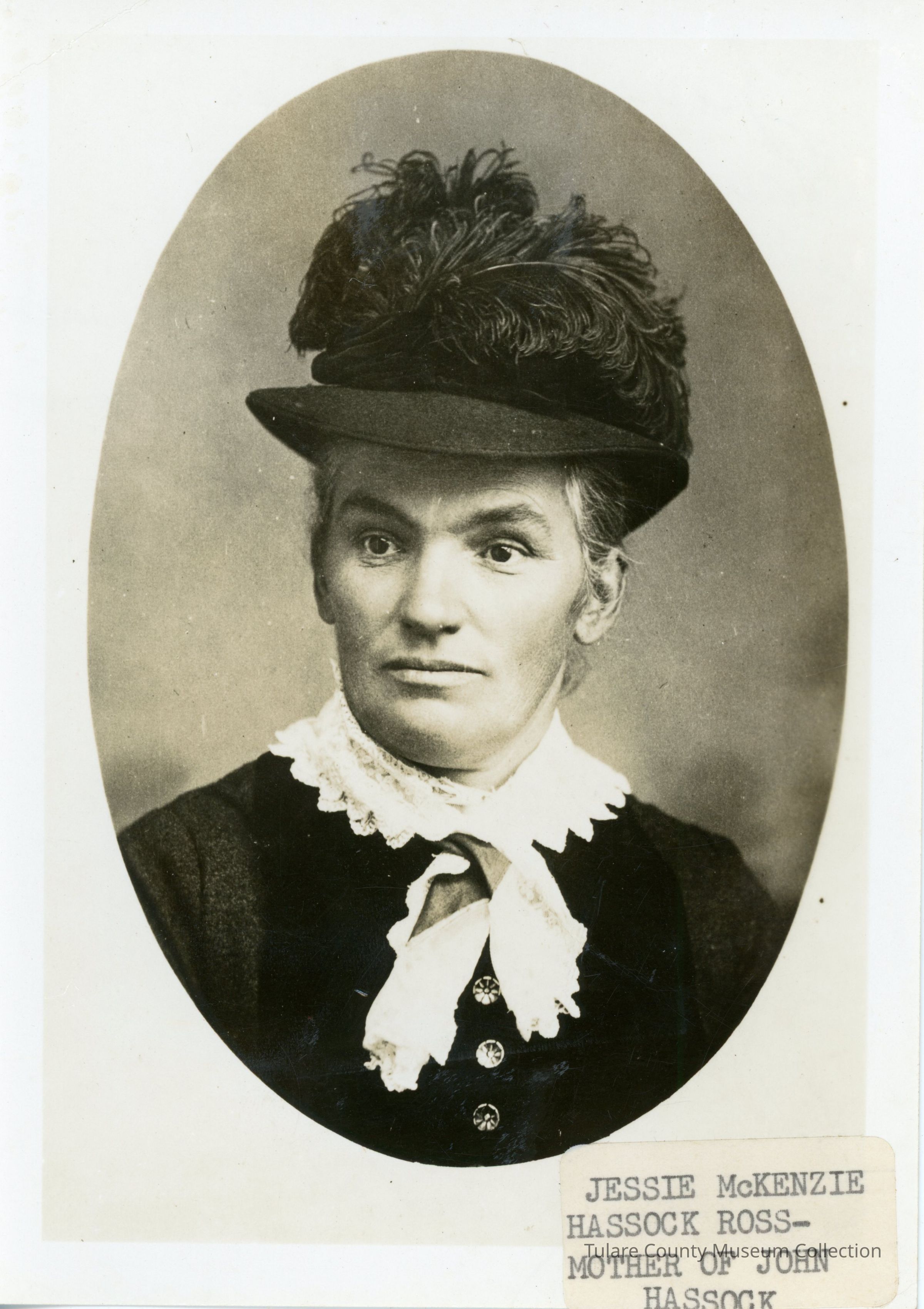 Professional portrait of an older woman dressed in formal clothing. She is wearing a hat with feathers adorning the top. Her facial expression is serious. The woman is identified by a tag on the bottom right corner of the photo as Jessie McKenzie Hassock Ross the mother of John Hassock.Lexicon