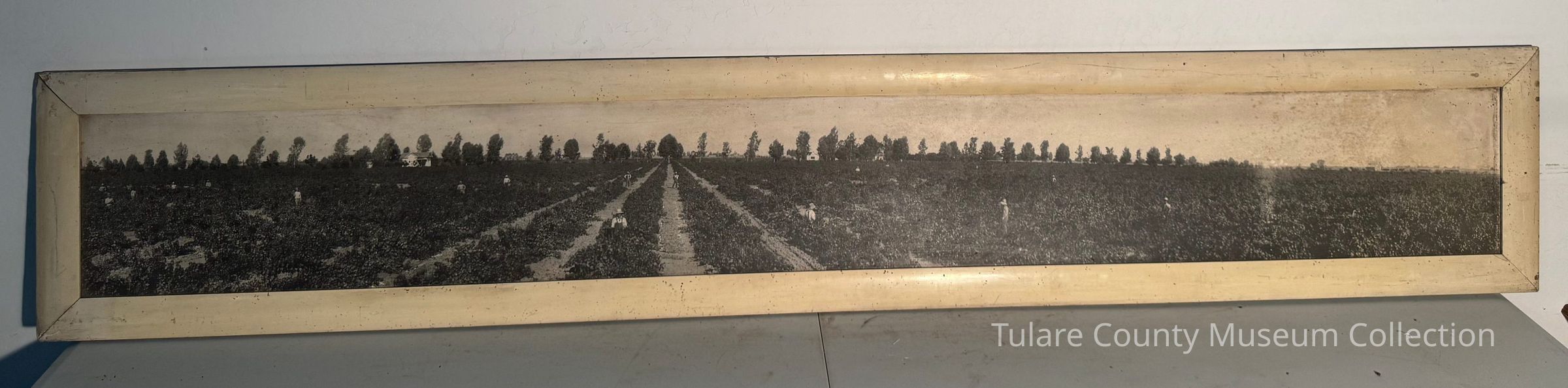 Black and white panoramic photo of orchard with workers in the field, and housing in the background. White frame.