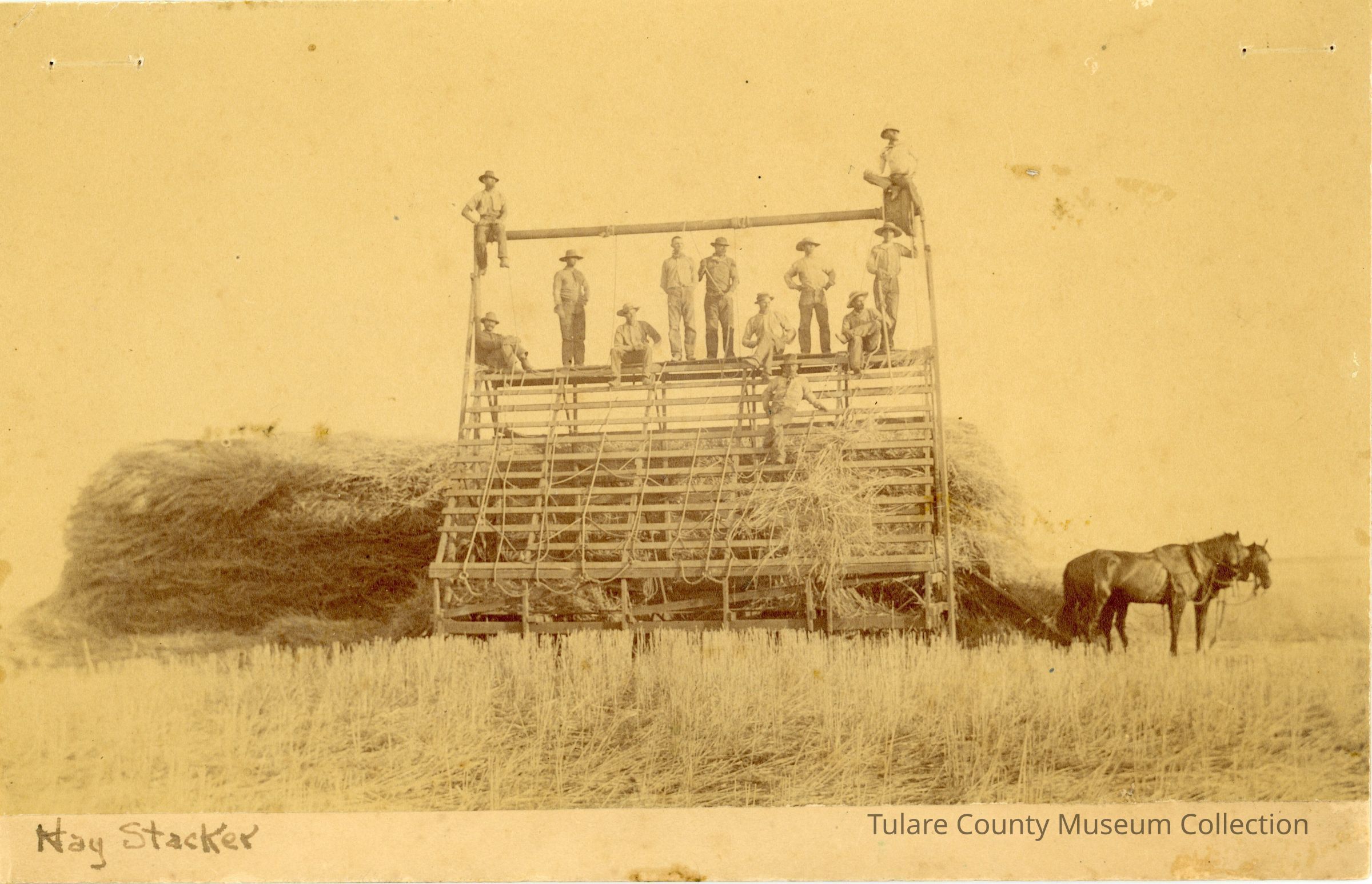 Several men operating a hay stacker being pulled by horses. The men are posing in different fashions along the top of the equipment.