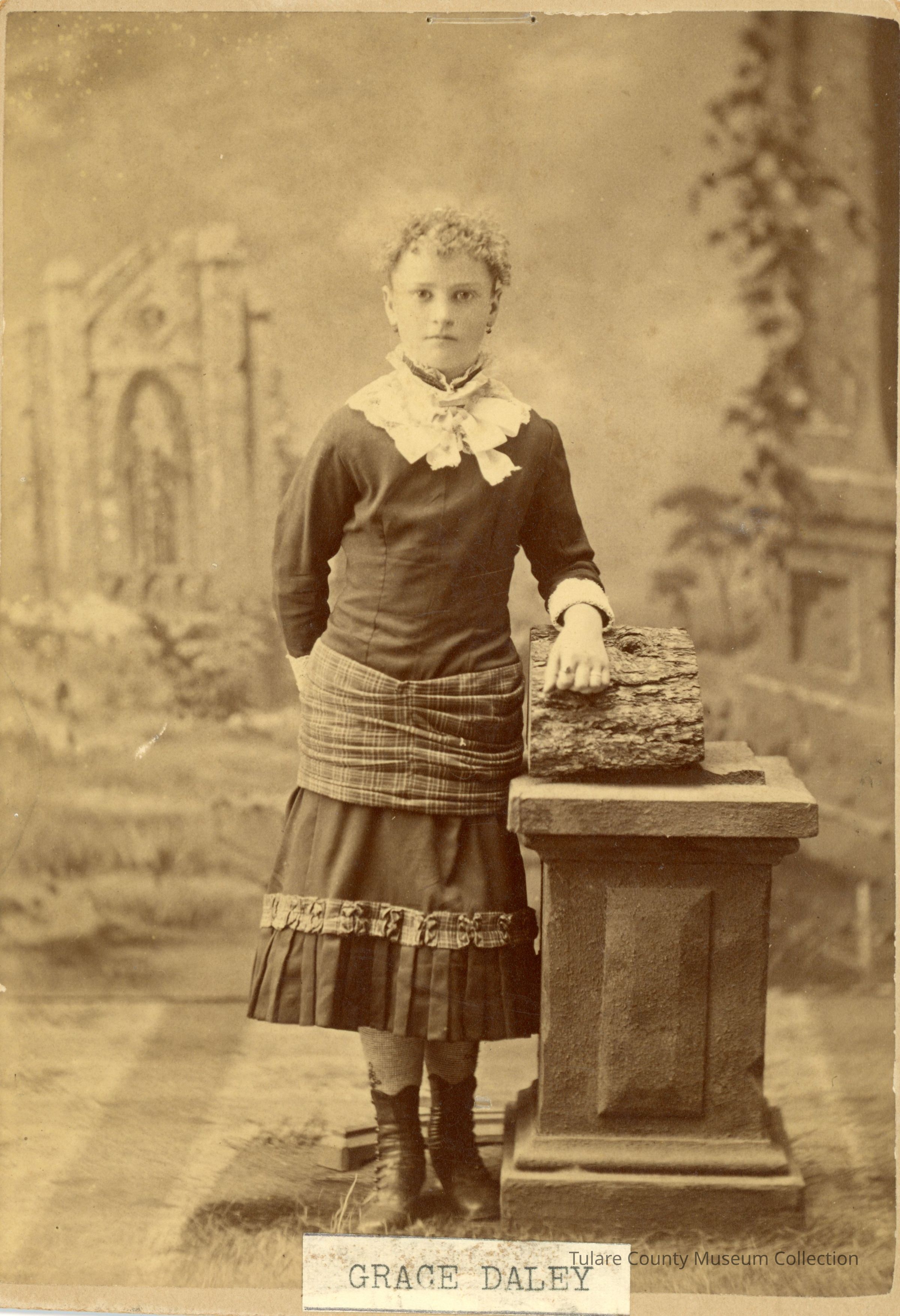 Formal portrait of a young lady identified as Grace Daley. She is posed standing next to a small log stacked on a short pedestal.