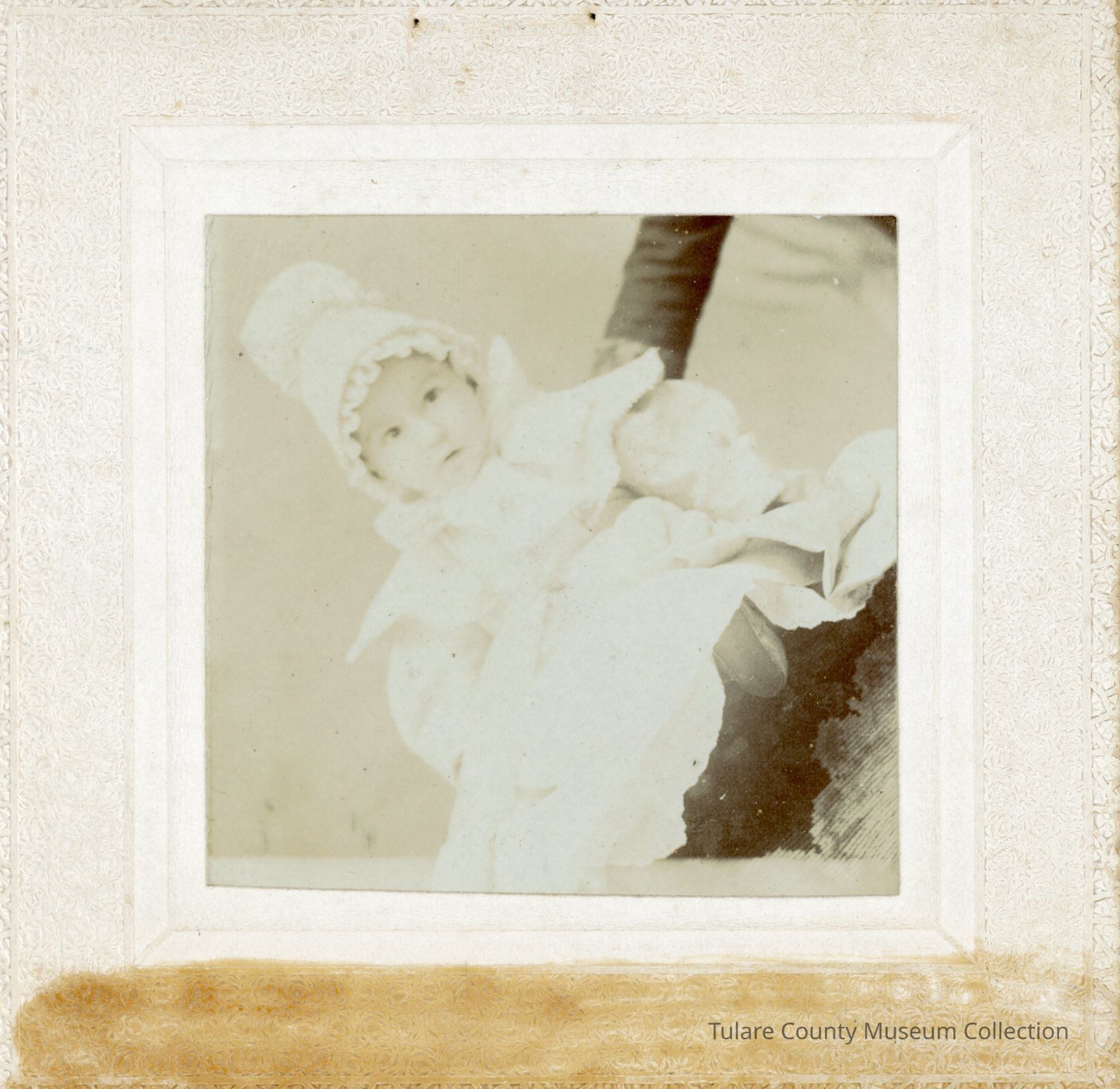 Formal portrait of an infant identified as James Way Hunsaker at the age of 10 months. The boy is dressed in a long white gown and a beanie hat with a large fluff ball on top.