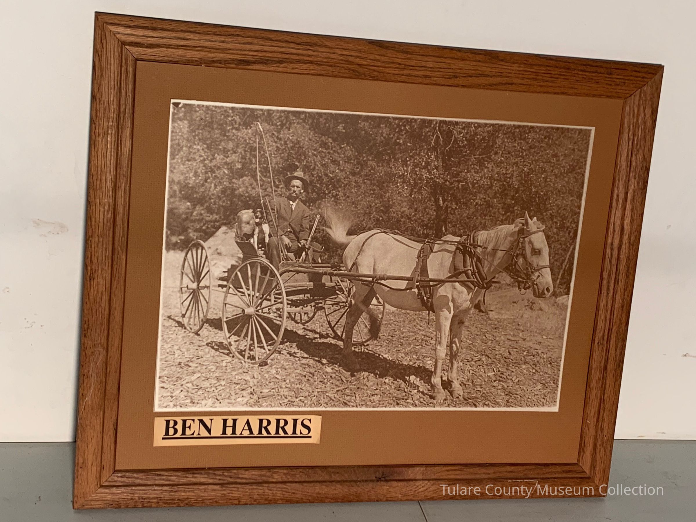 Framed photograph of Man sitting in a horse carriage. Labeled Ben Harris.