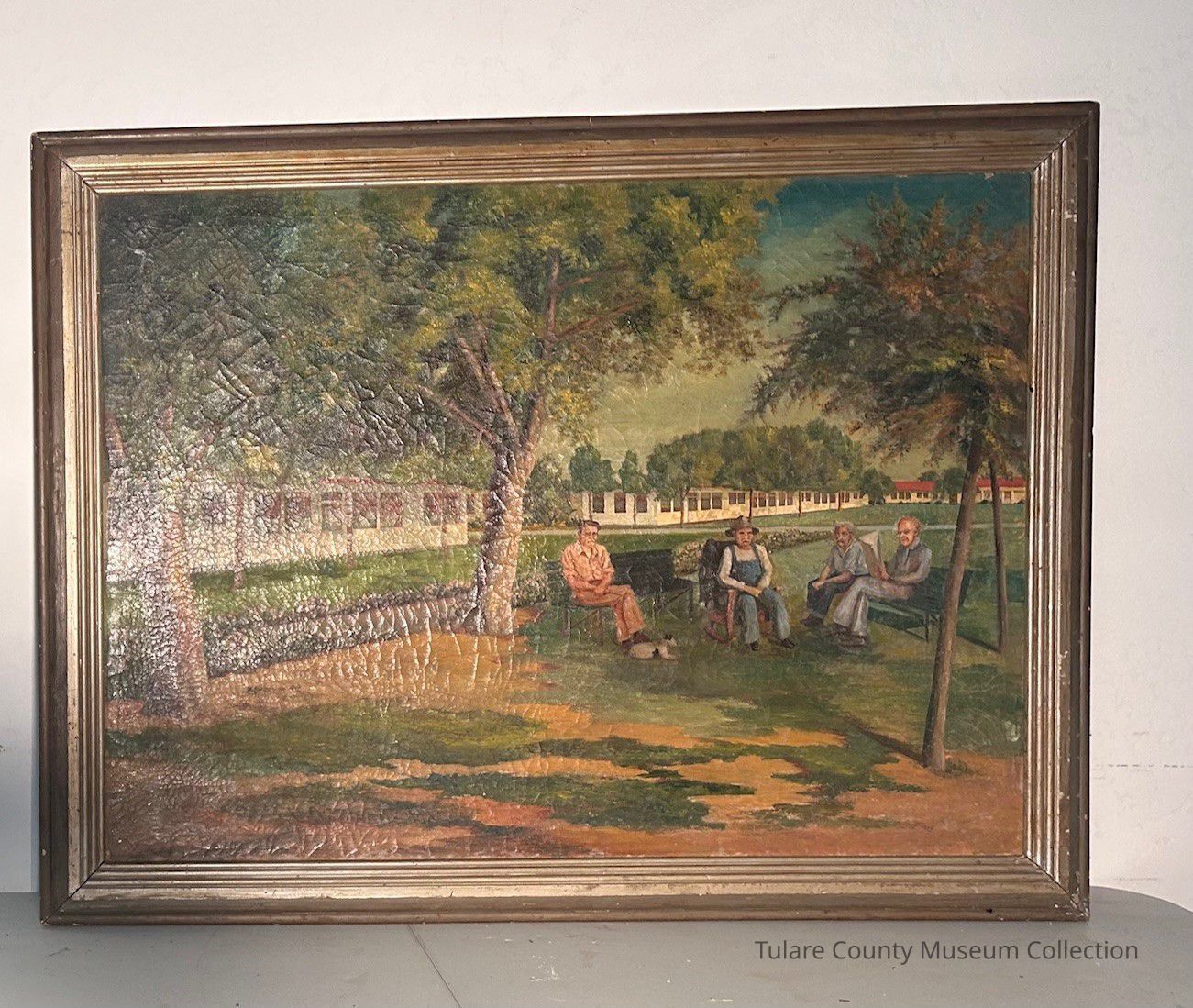A painting of four people sitting on benches underneath a tree canopy. They are located in, what seems to be, a park surrounded by housing complexes.Lexicon