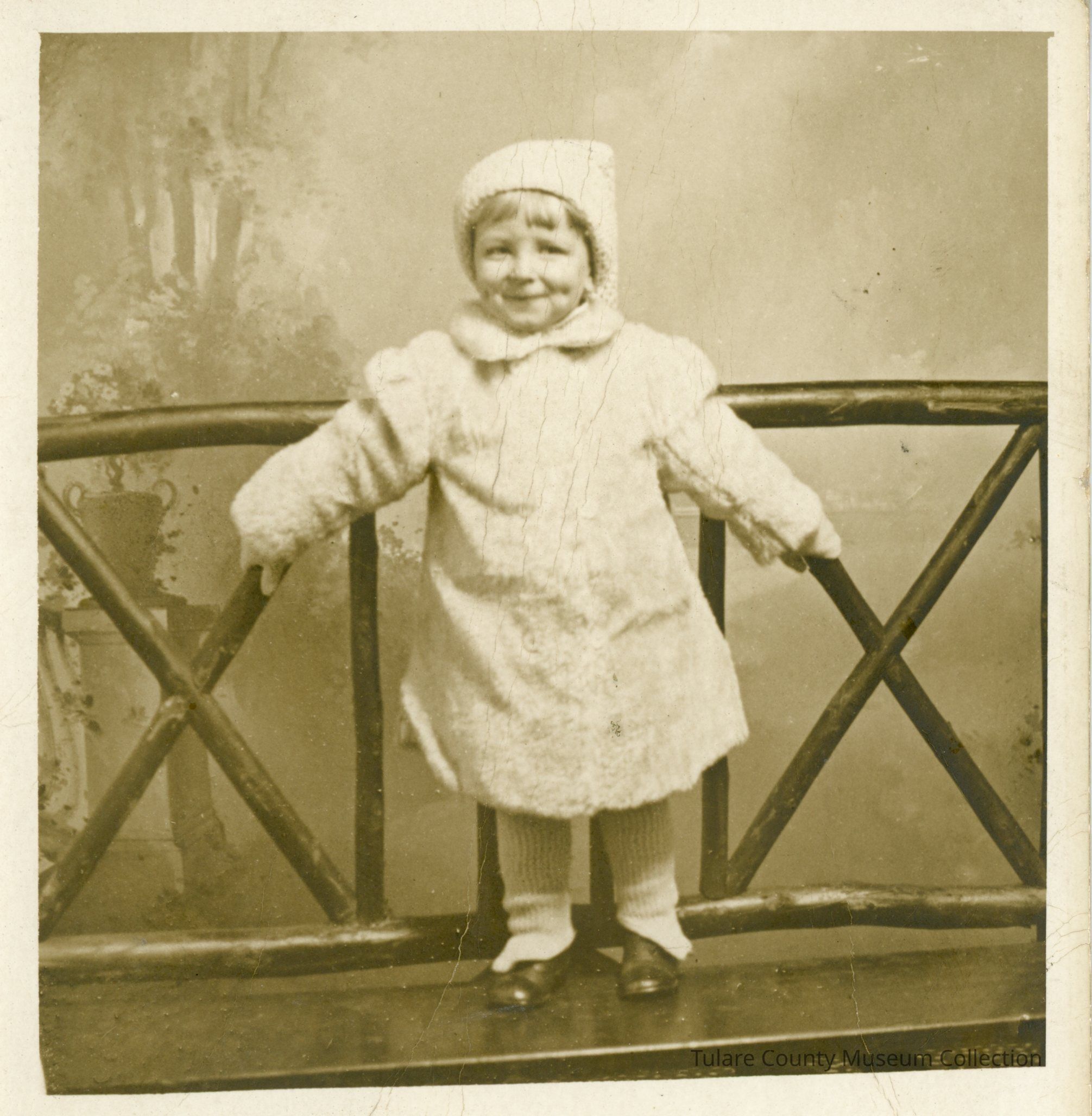 Louise Hemming's son (Gordon Cook) standing against a branch fencing and holding onto it with both hands. He is wearing knitted stockings, hat, and a long jacket.Lexicon