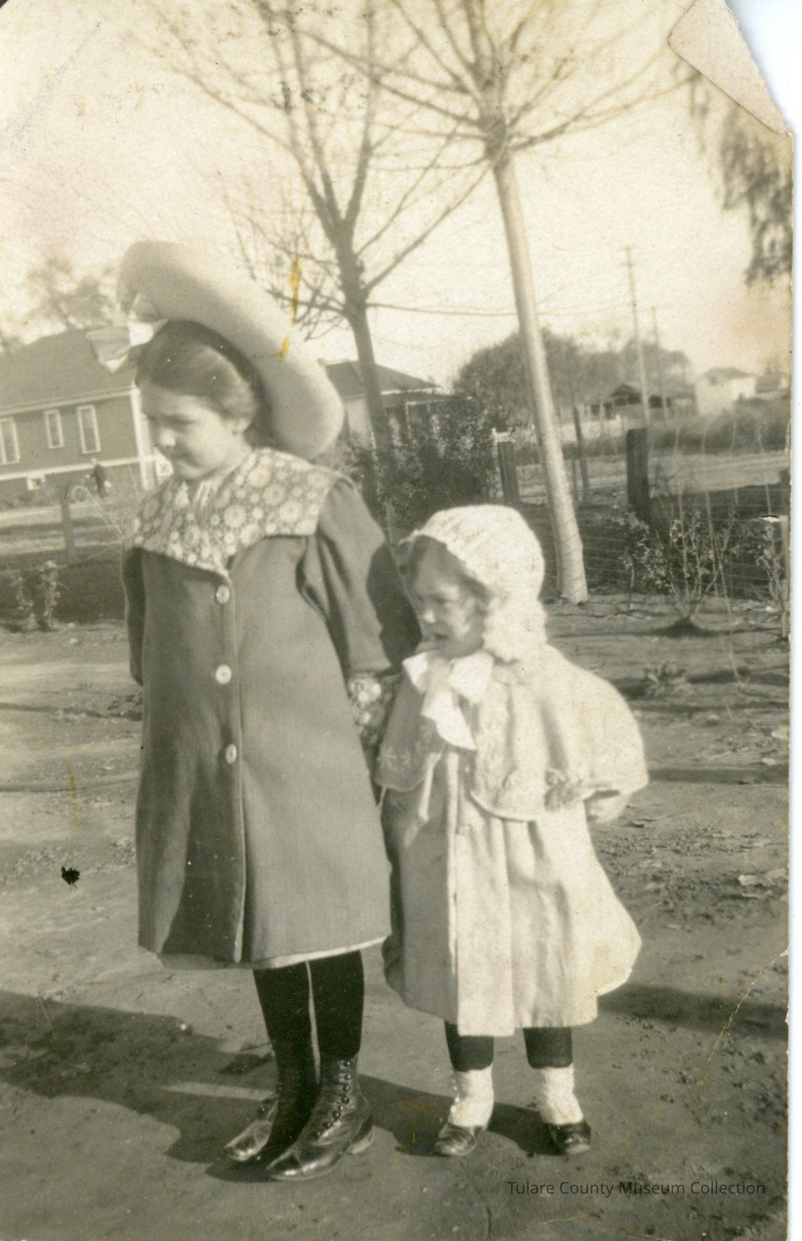 Young Alene Hemming with dark dress and flowery collar and big white hat standing with young Gladys in white dress and bonnet.