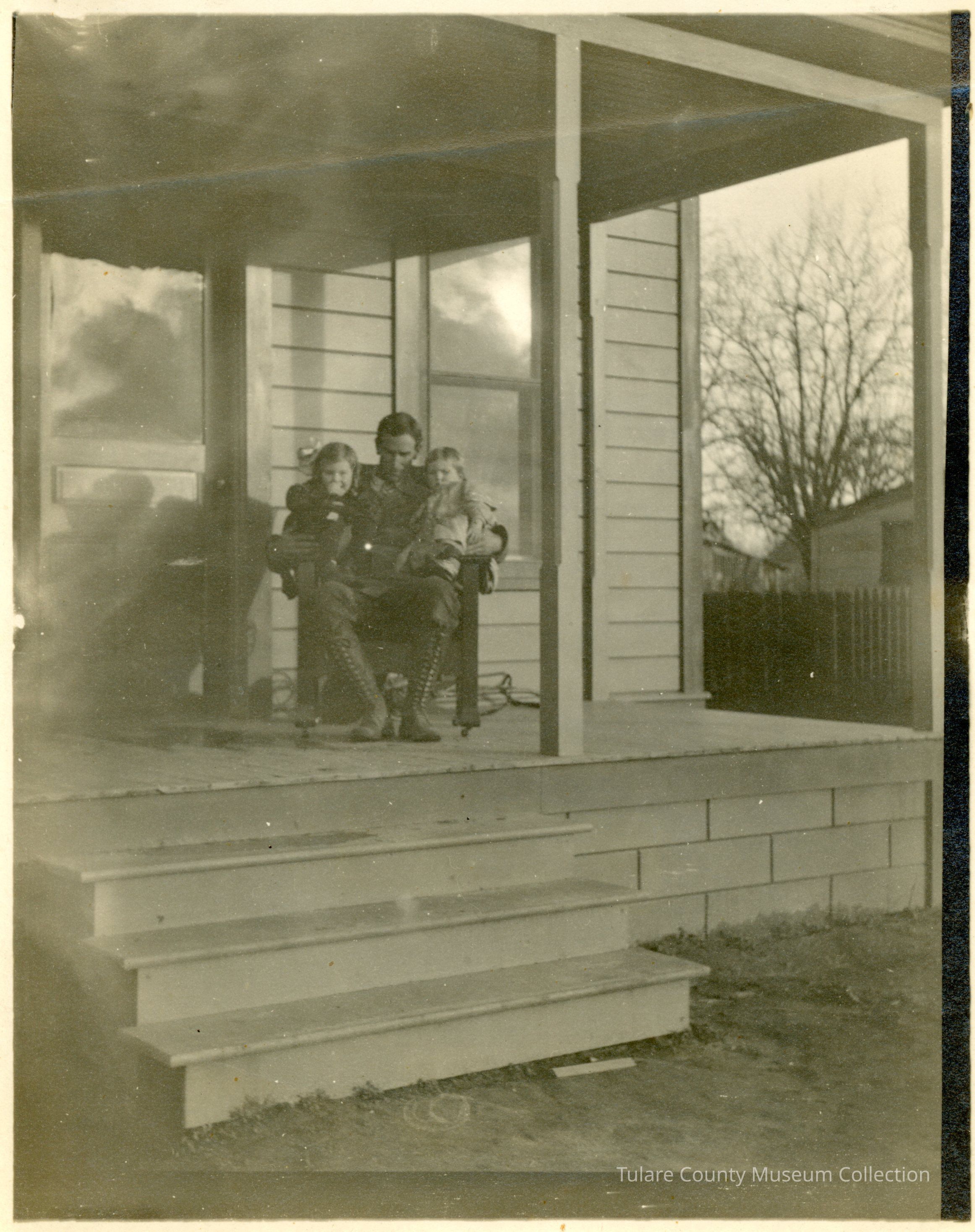 Burton Smith sitting on porch with his children Gladys and Alma