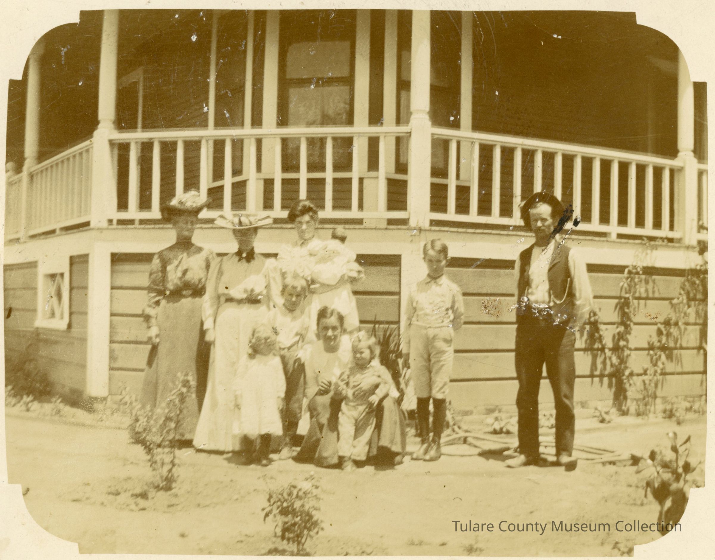 Four ladies, five children and one man standing in front of a house, far left Great Grandmother Nancy Smith, Edith Irene third from leftLexicon