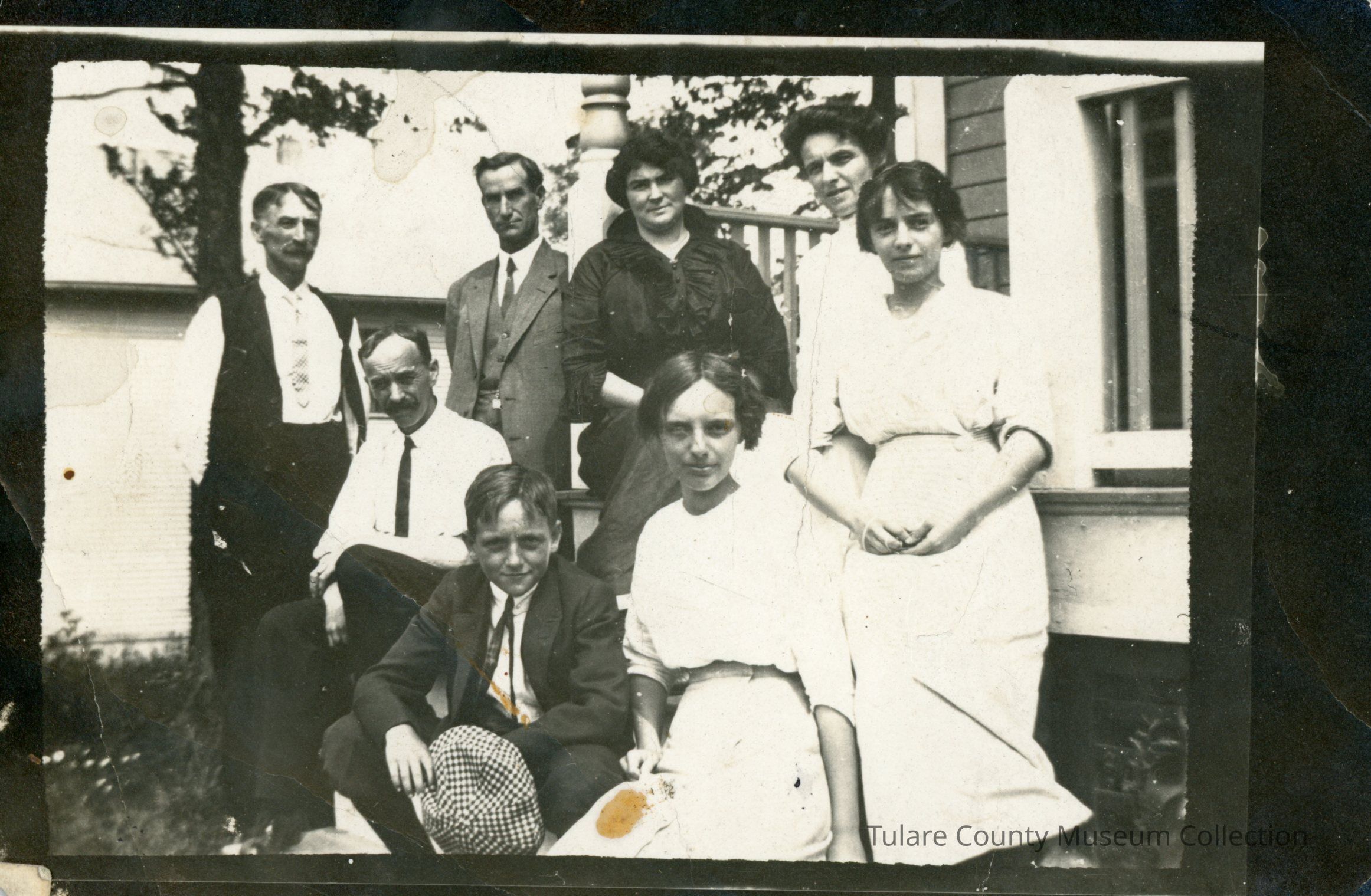 Eight individuals in front of a porch, Burton Smith in suit and tie, Edith Irene in black dressLexicon