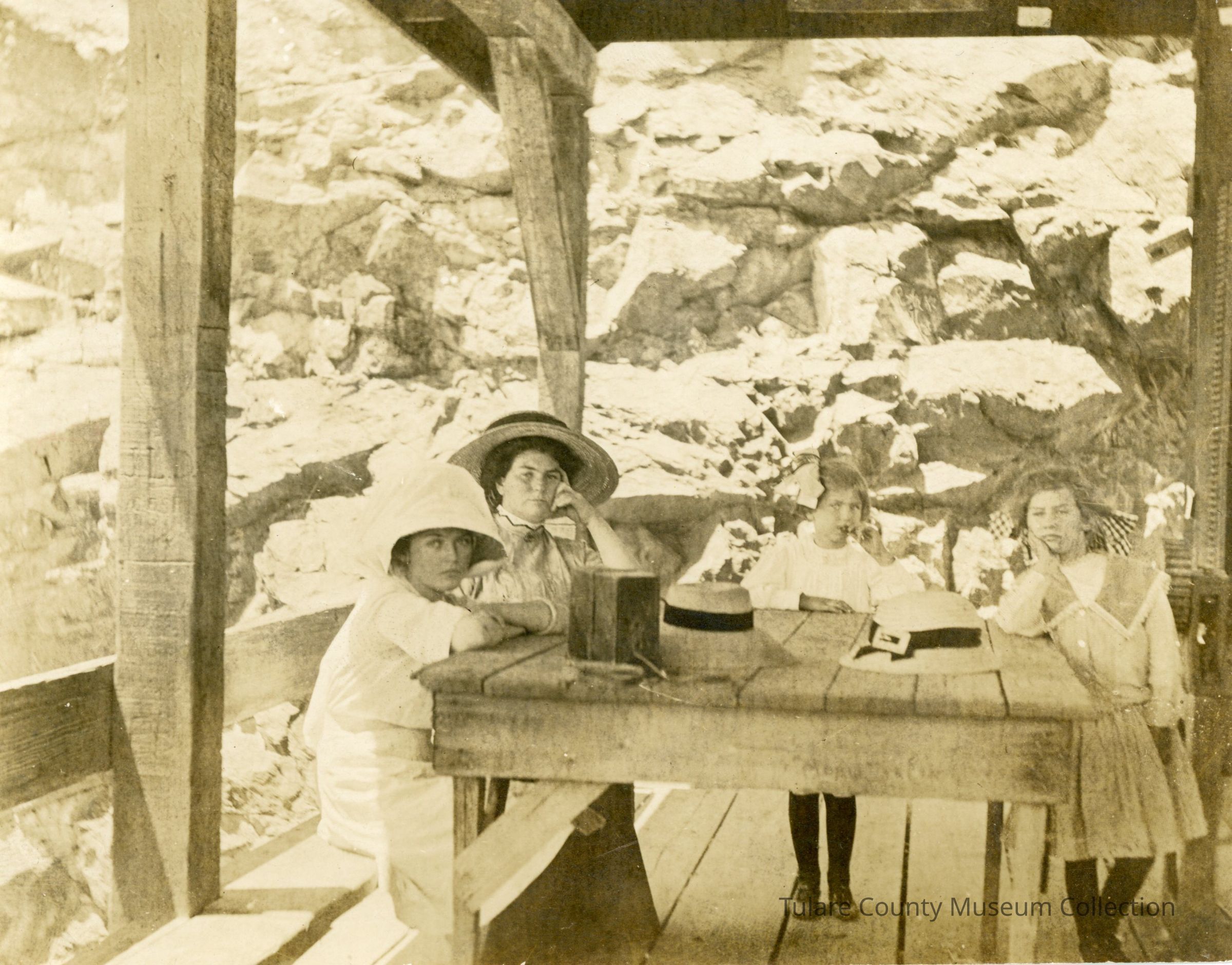Two women and two children sitting and standing around a table. Left to right: Alene, Edith Irene, Alma and Gladys.Lexicon