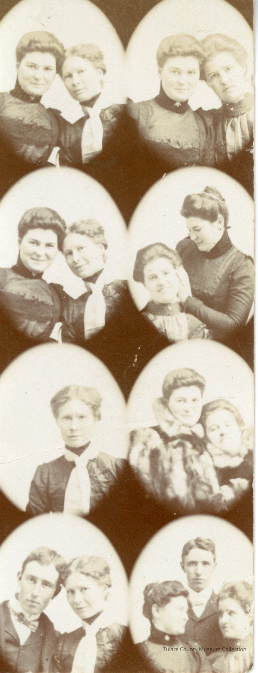 8 Small snap shots on one photo. Two women and one man present in photos, woman with dark collar (Edith Hemming Smith)
