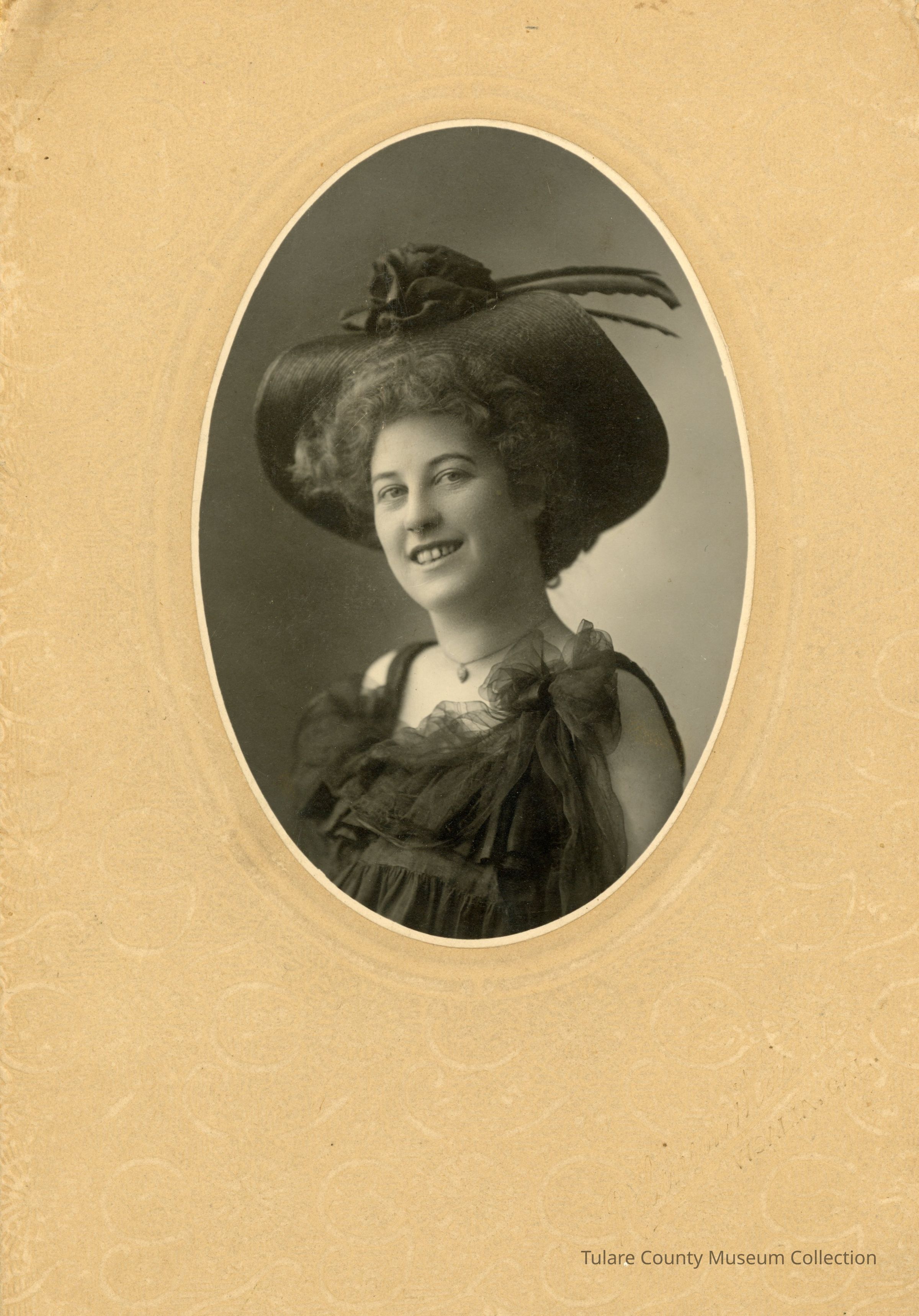 (1) Oval shaped with artistic tan cardboard backing with Robinson & Weishar Visalia, Cal signage. Picture of a woman in a black lace dress and black hat. The woman is most likely Hazel StevensonLexicon