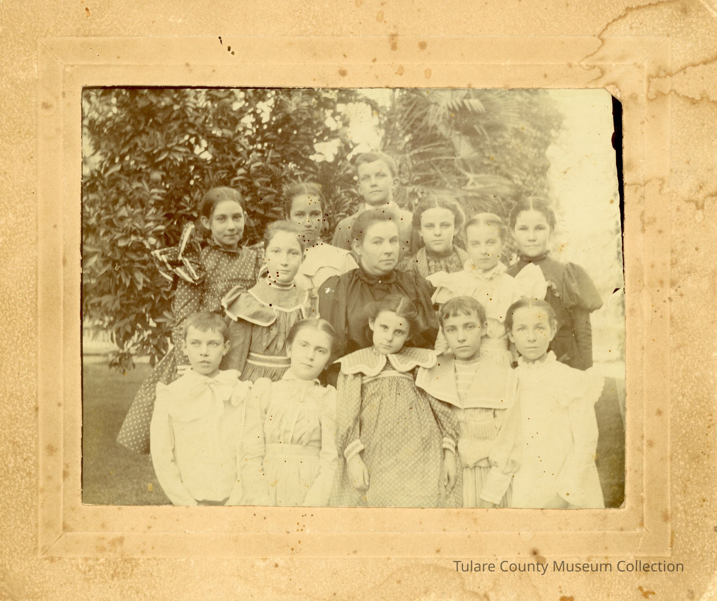 (1) Possibly a small class photo with woman in black dress in center surrounded by children, all persons are unidentified.