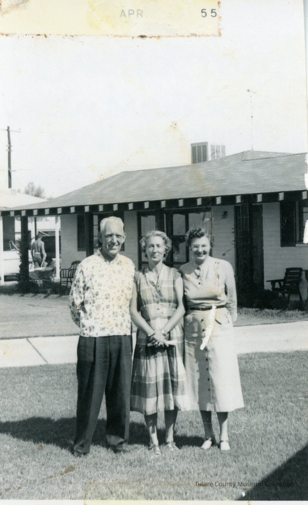 (1) Small photo of (left to right) Sebert Stevenson Jr, Irene Louise Eward Weber Steinhouse Hopp, and Luella Brock Stevenson from April 1955 standing on the lawn in front of a house.Lexicon