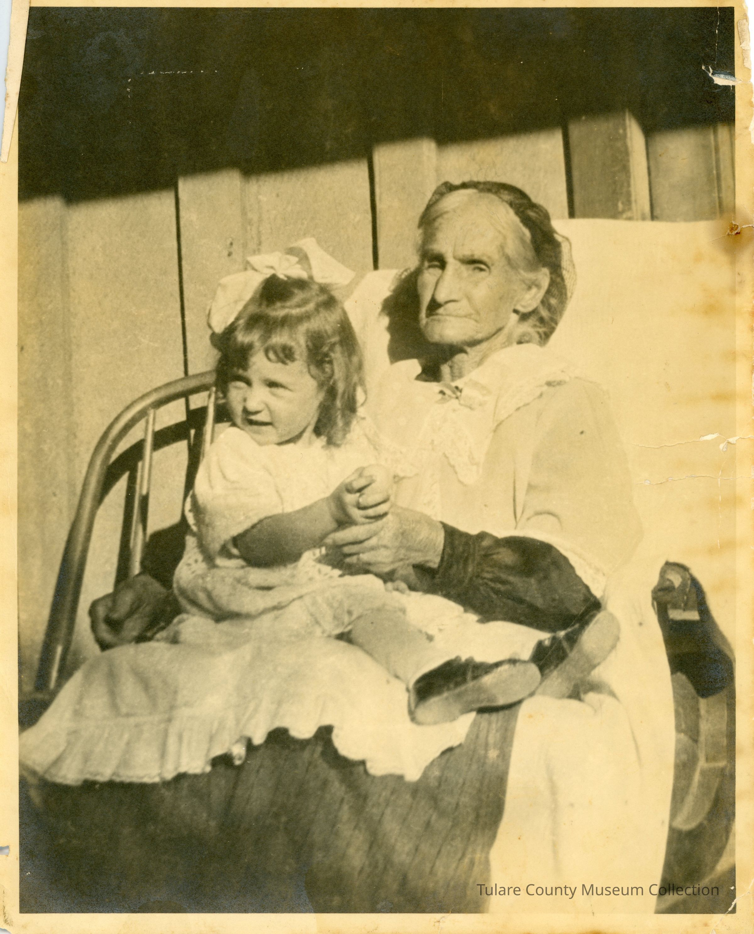 (1) Larger photo of Irene Louise Eward (child) sitting in lap of Elizabeth O'Connor (great grandmother on mother's side) on a porch.