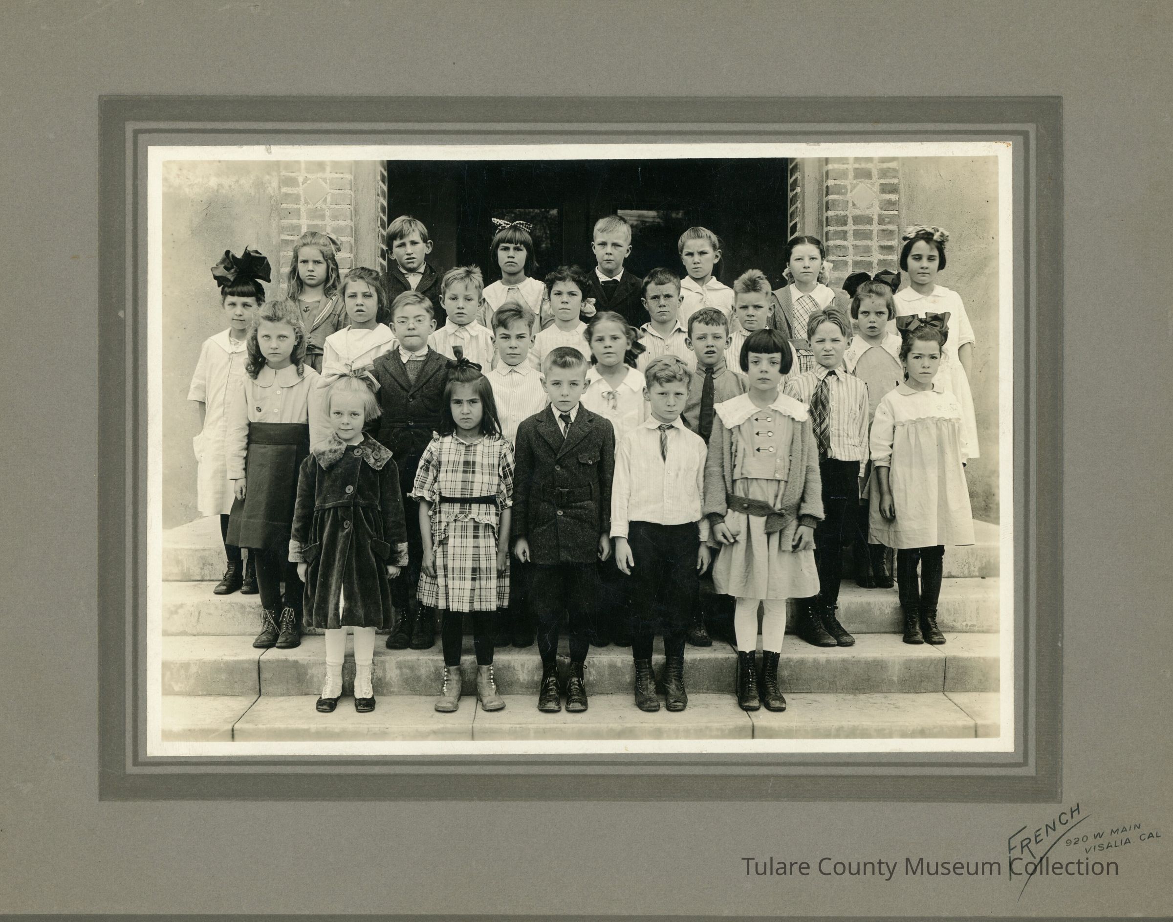 (1) School class portrait against gray cardboard backig with French 920 W. Main Visalia, Cal. insignia. Irene Louise Eward 3rd row up on the far left with large black bow in hair age 7 years 2nd grade Highland School.Lexicon