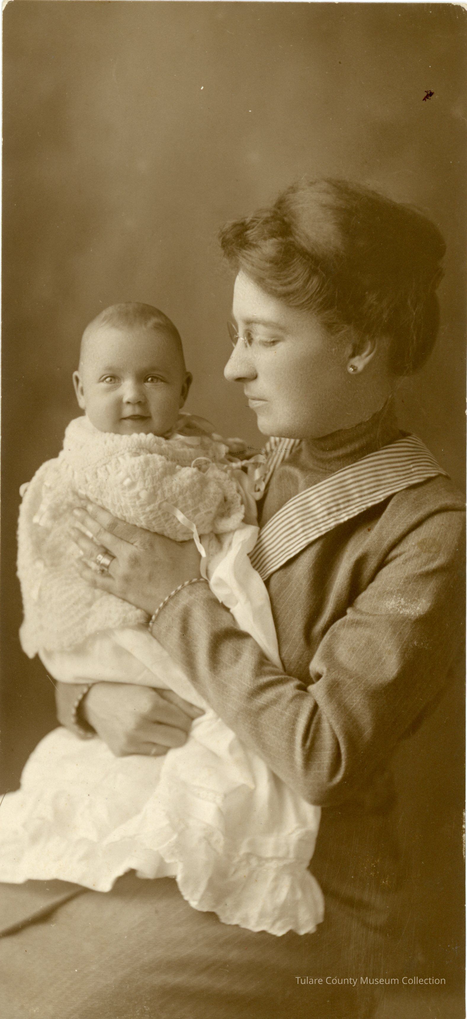 (1) Picture of Hazel Stevenson Eward holding her daughter Irene Louise Hazel. Hazel is facing her daughter who is dressed in a long white gown.