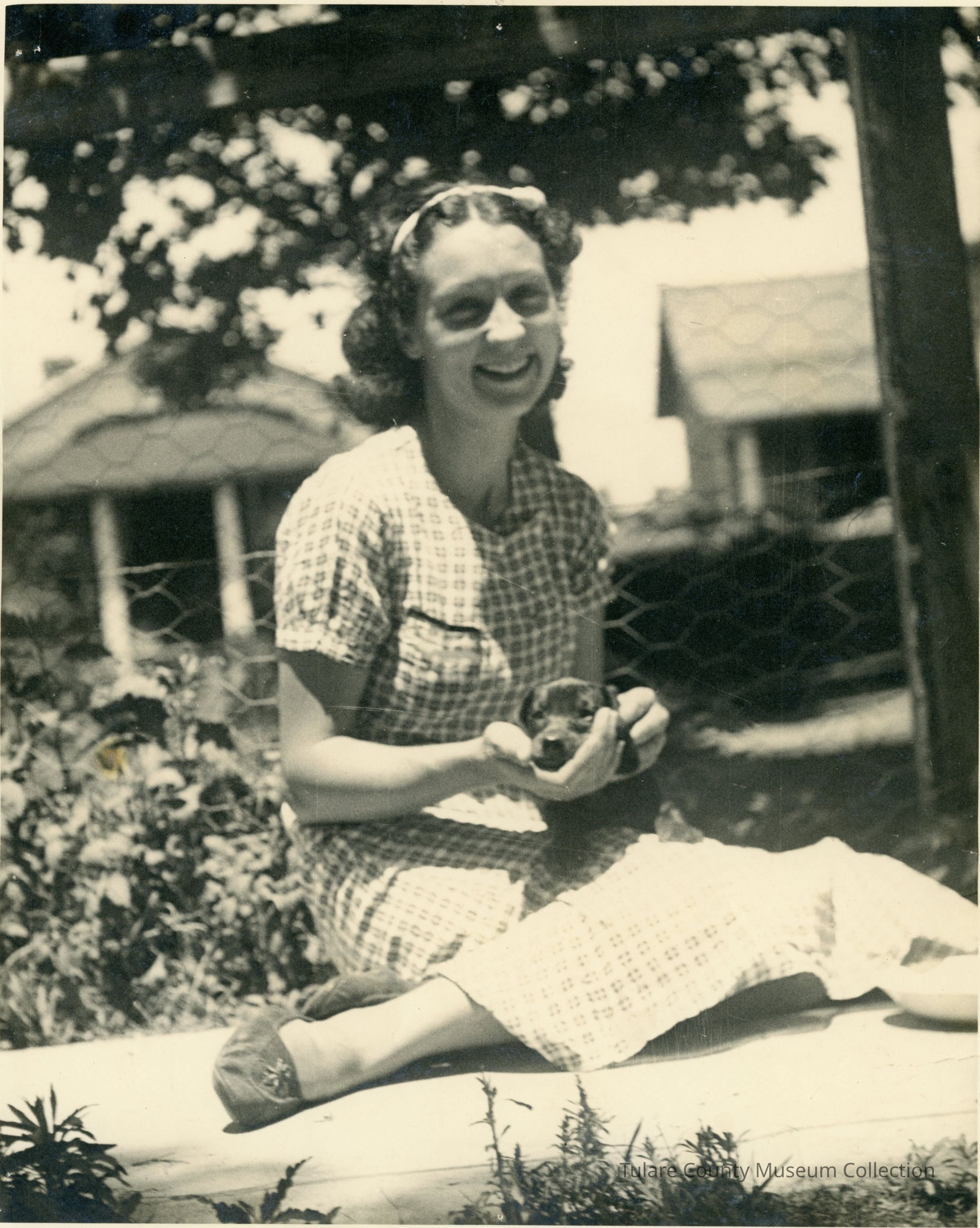 (1) Photo of Irene Louise Eward (most likely) holding a small puppy and sitting with her legs bent to the side. She has a white hair band in her hair and a checkered dress