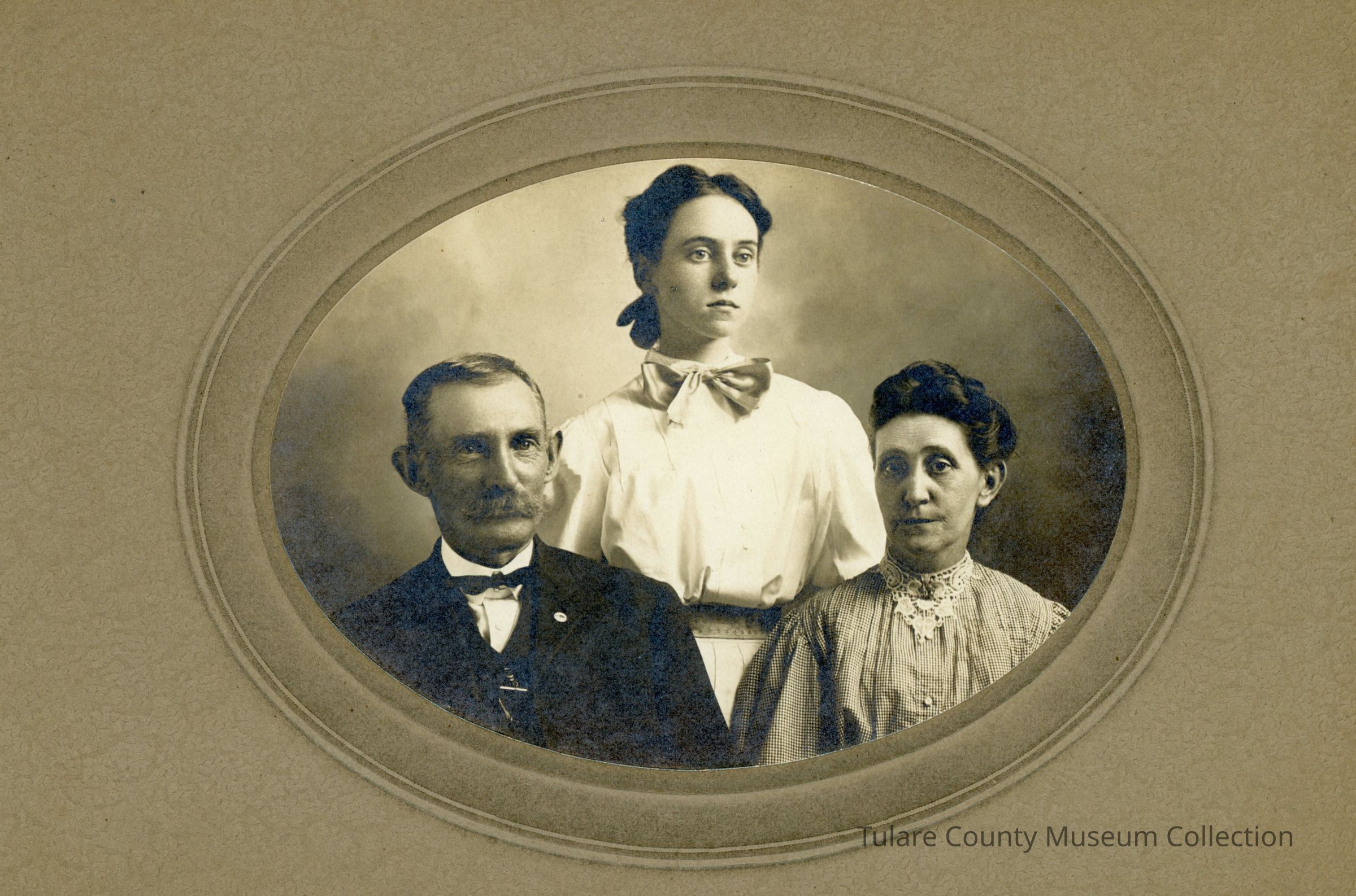 (1) Oval shaped photo against a light brown background of Thomas Perry Eward and wife Emma Eward with daughter Della standing in the middle.