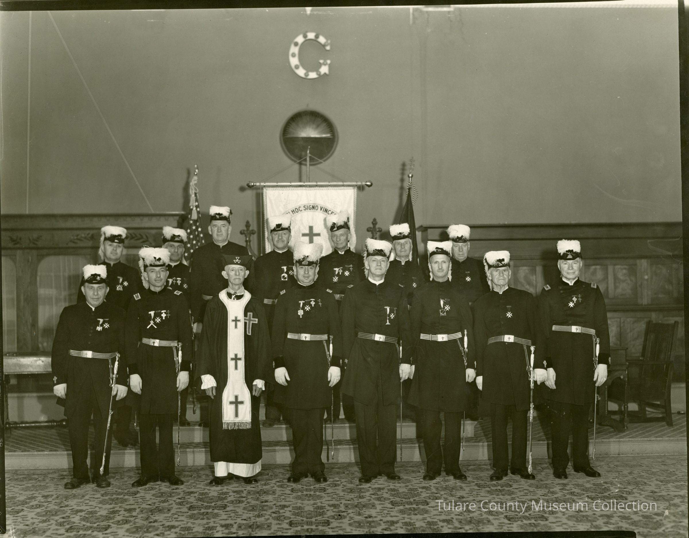 Group of 15 men dressed in full uniform standing in two rows in front of an altar.
