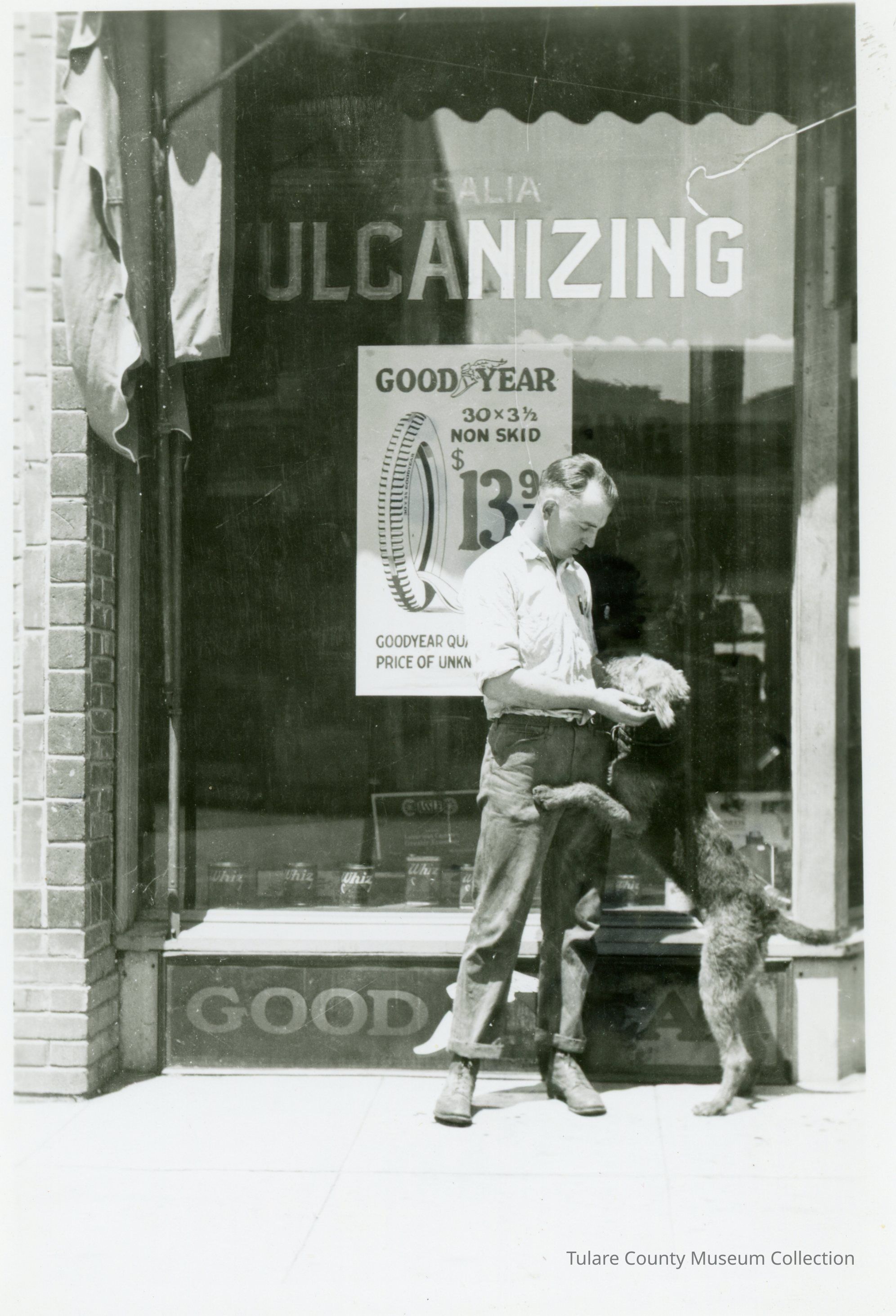 Man petting dog in front of Goodyear tire store front