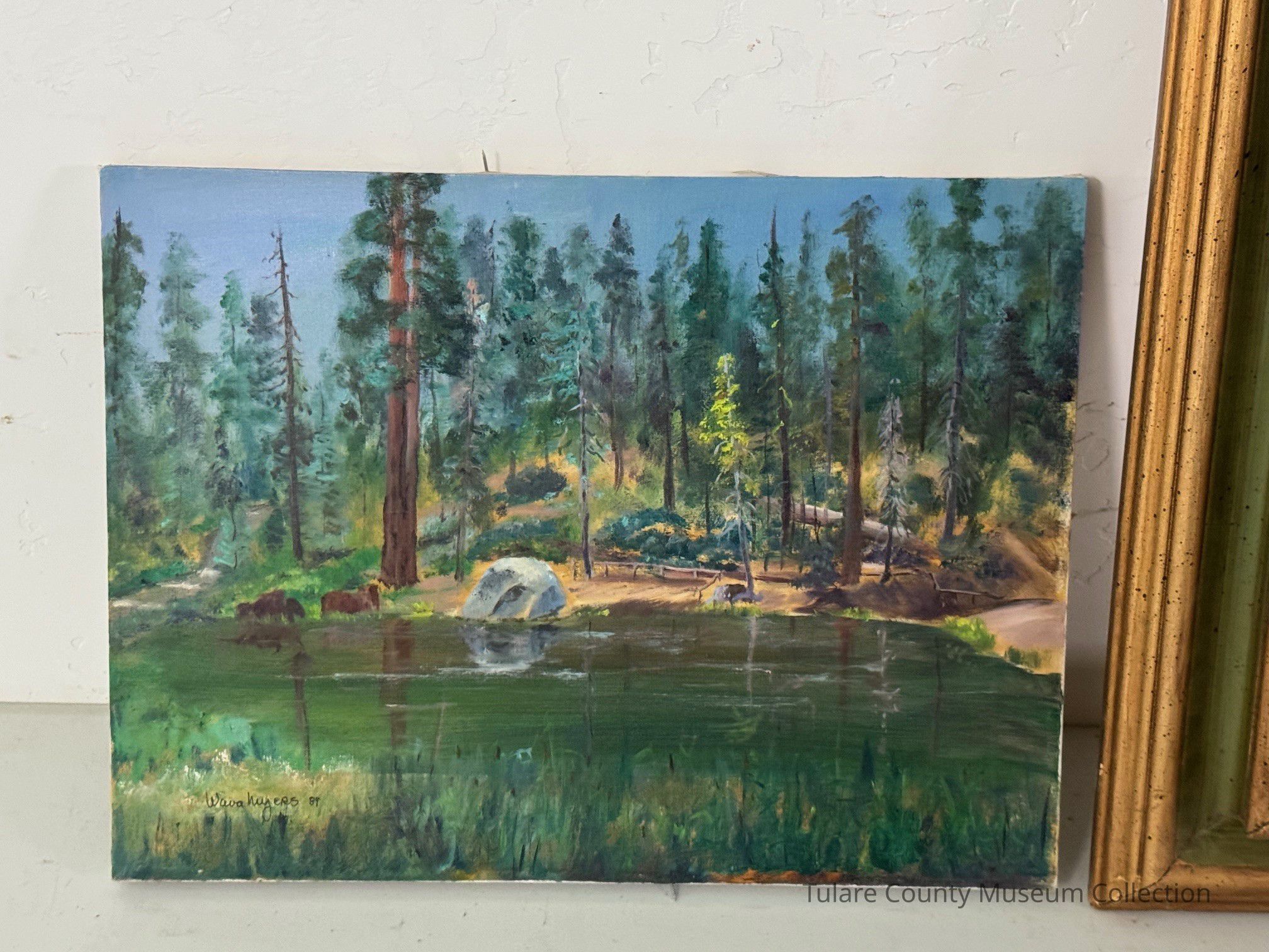 Vibrant painting of pond surrounded by trees and rocks.