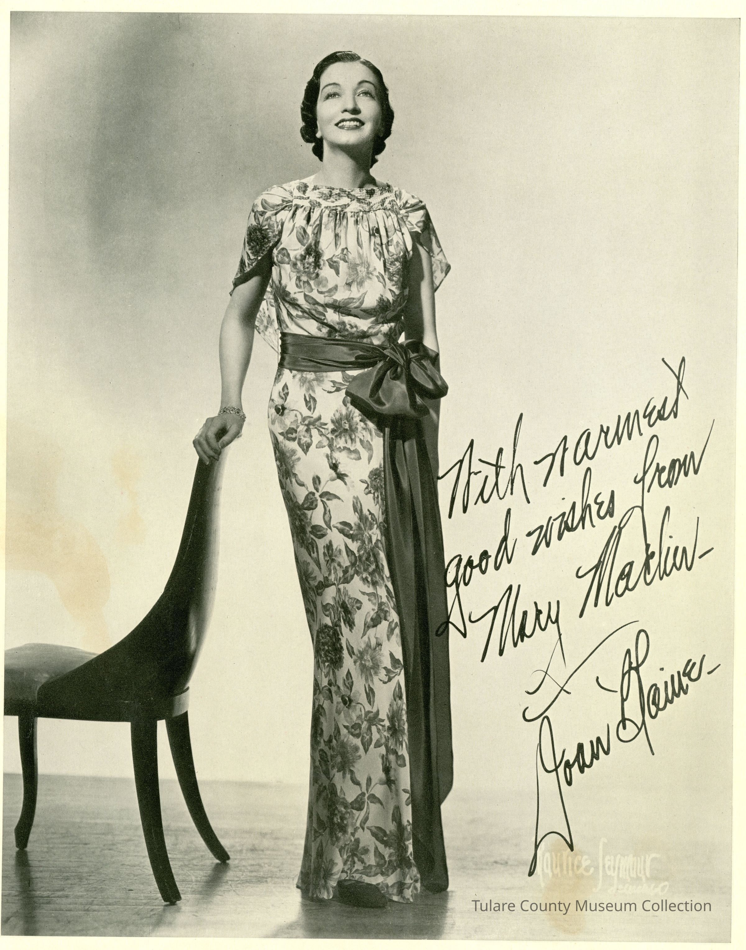 Full length portrait of a woman wearing a long dress with a large bow on the side. The glossy photo is autographed.