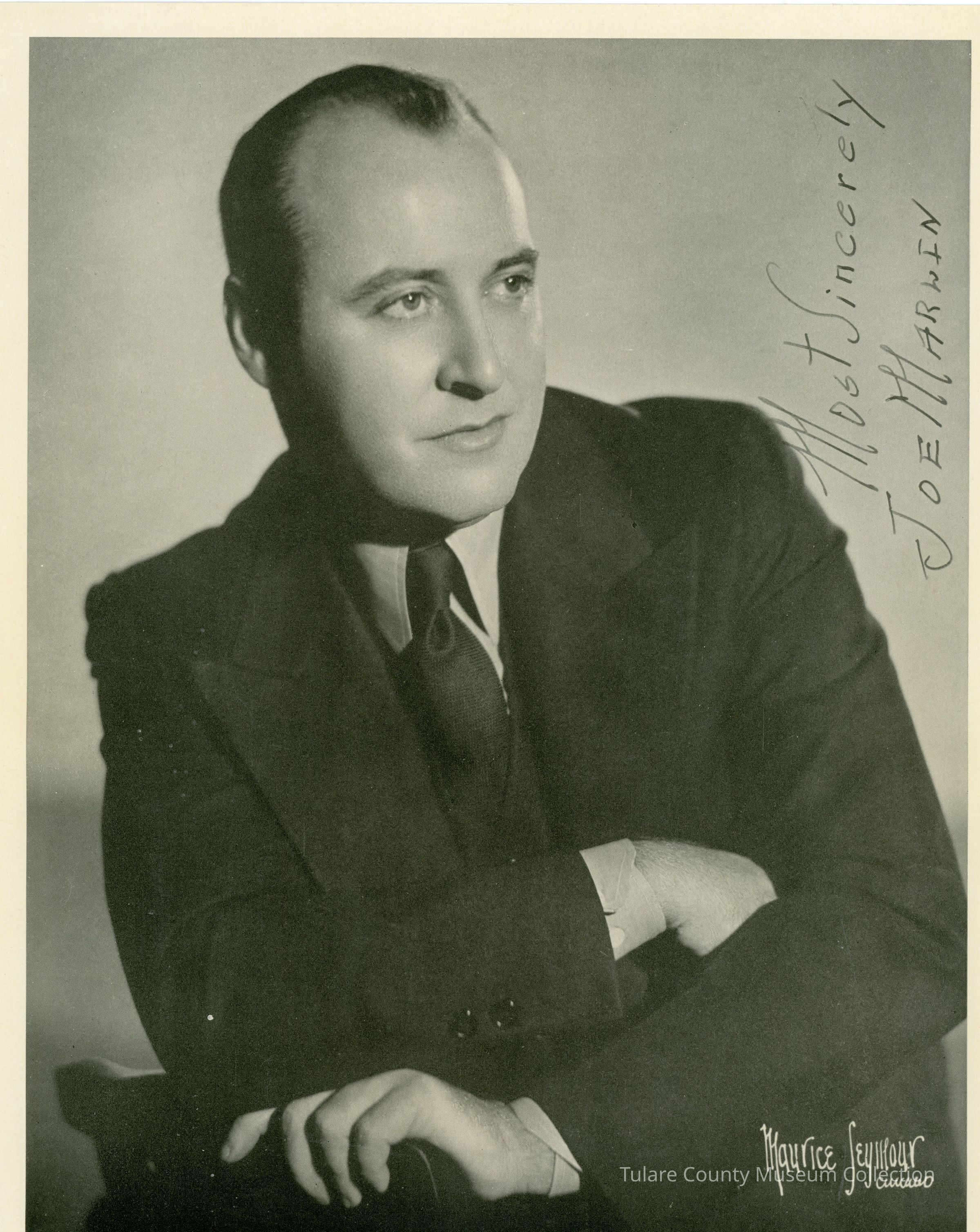 Portrait of a man dressed in a suit and tie with his arms crossed as he looks out to the left. The photo is signed "Most Sincerely Joe Marlin"