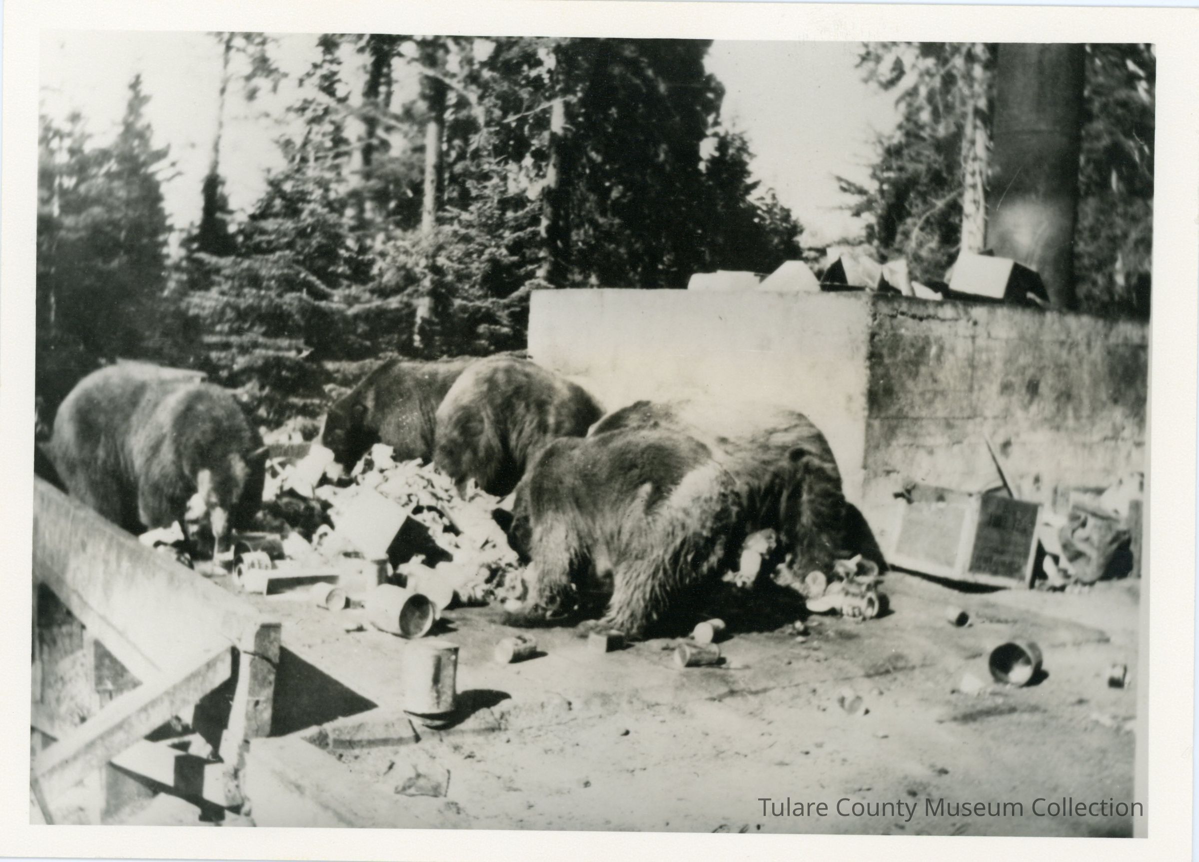 Giant Forest Bear Pit (1929). Black and white photo of a group of five bears rummaging through a pile of trash.