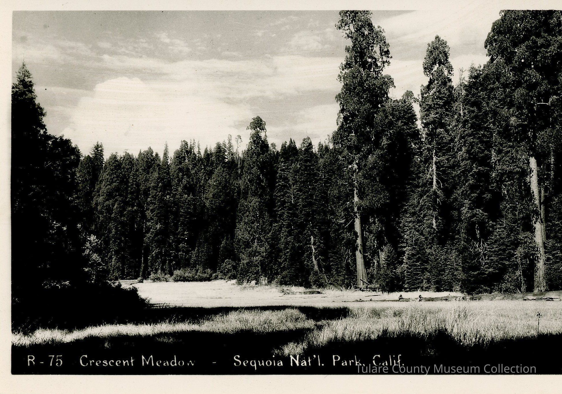 3.5x5.5 postcard of Crescent Meadows in Sequoia National Park. Black and white print. No writing on the back.