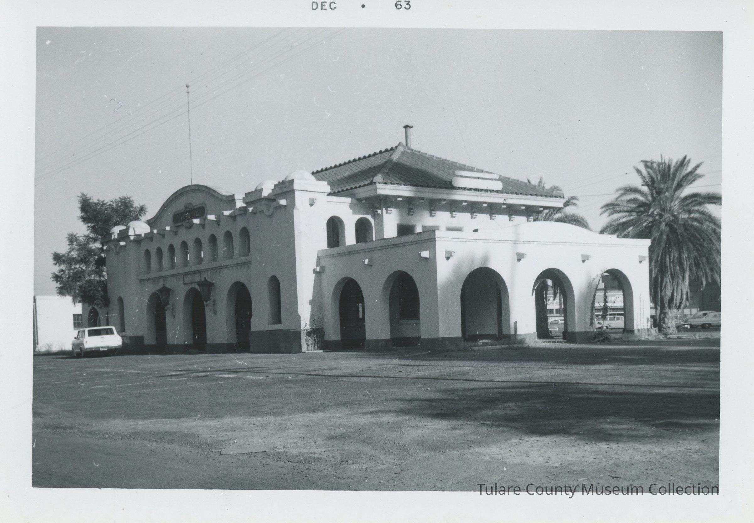 This is the west end and north side of the Southern Pacfic passenger depot at Visalia. The depot is located at 207 East Oak Street. It opened September 12, 1916. It served passenger trains of the Southern Pacific Company and the Visalia Electric Railroad. The most important train that served Visalia was Southern Pacific's Sequoia. This train provided coach and pullman service between Oakland and Porterville. The last passenger service was discountinued on October 3, 1940. The tracks are located in the center of Oak Street behind the photographer. Since 1971 the building has been a restaurant. The area in the foreground has been extensively landscaped.