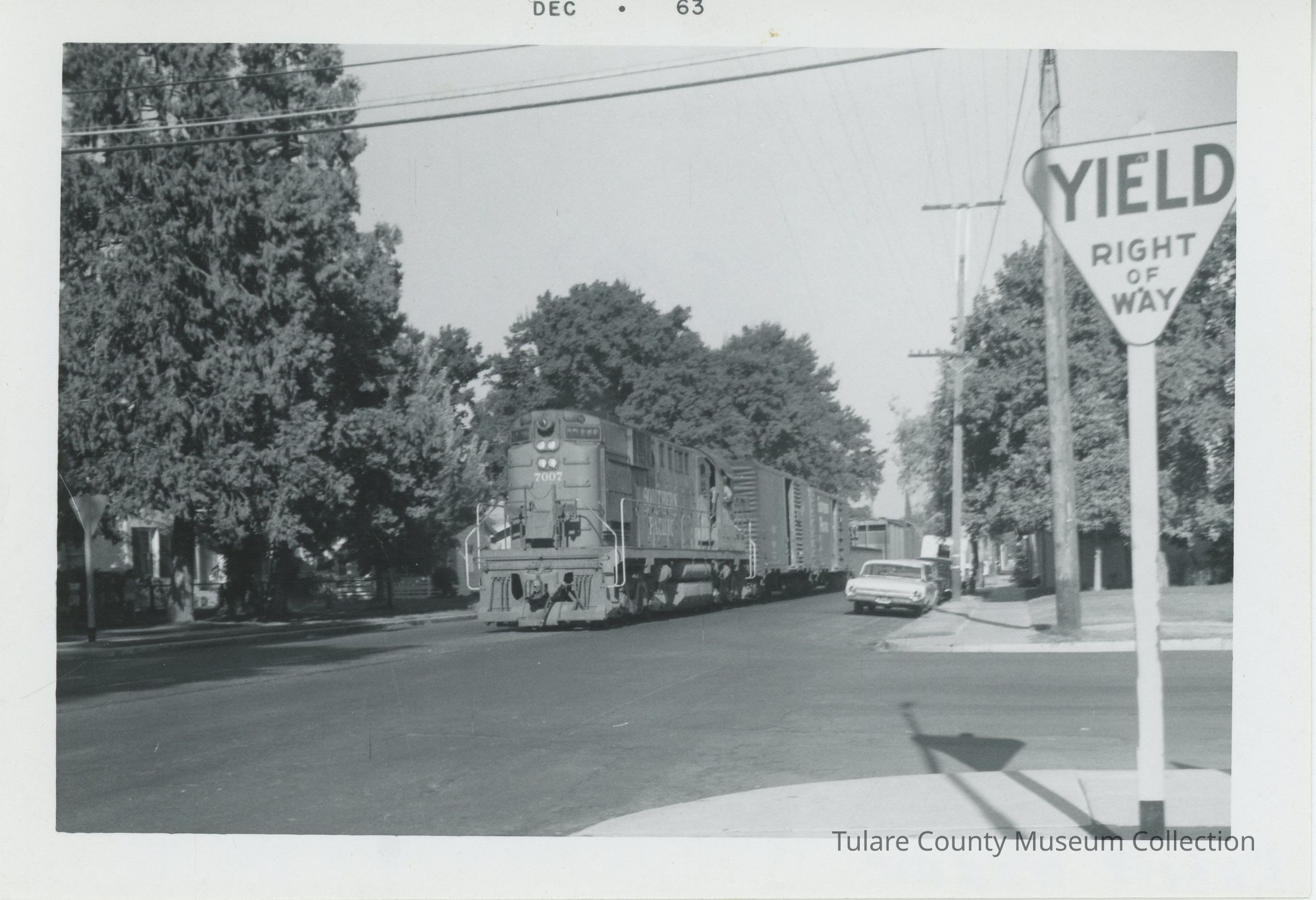 Souther Pacific locomotive 7007 leads a westbound freight train down Oak Street in Visalia. The track in Oak Street was contstructed in 1893 by the Visalia Railroad. This line was eventually acquired by the Southern Pacific Company. This view loosk east. It is unlikely that the train yeilded right of way to motor vehicles passing through the intersection.