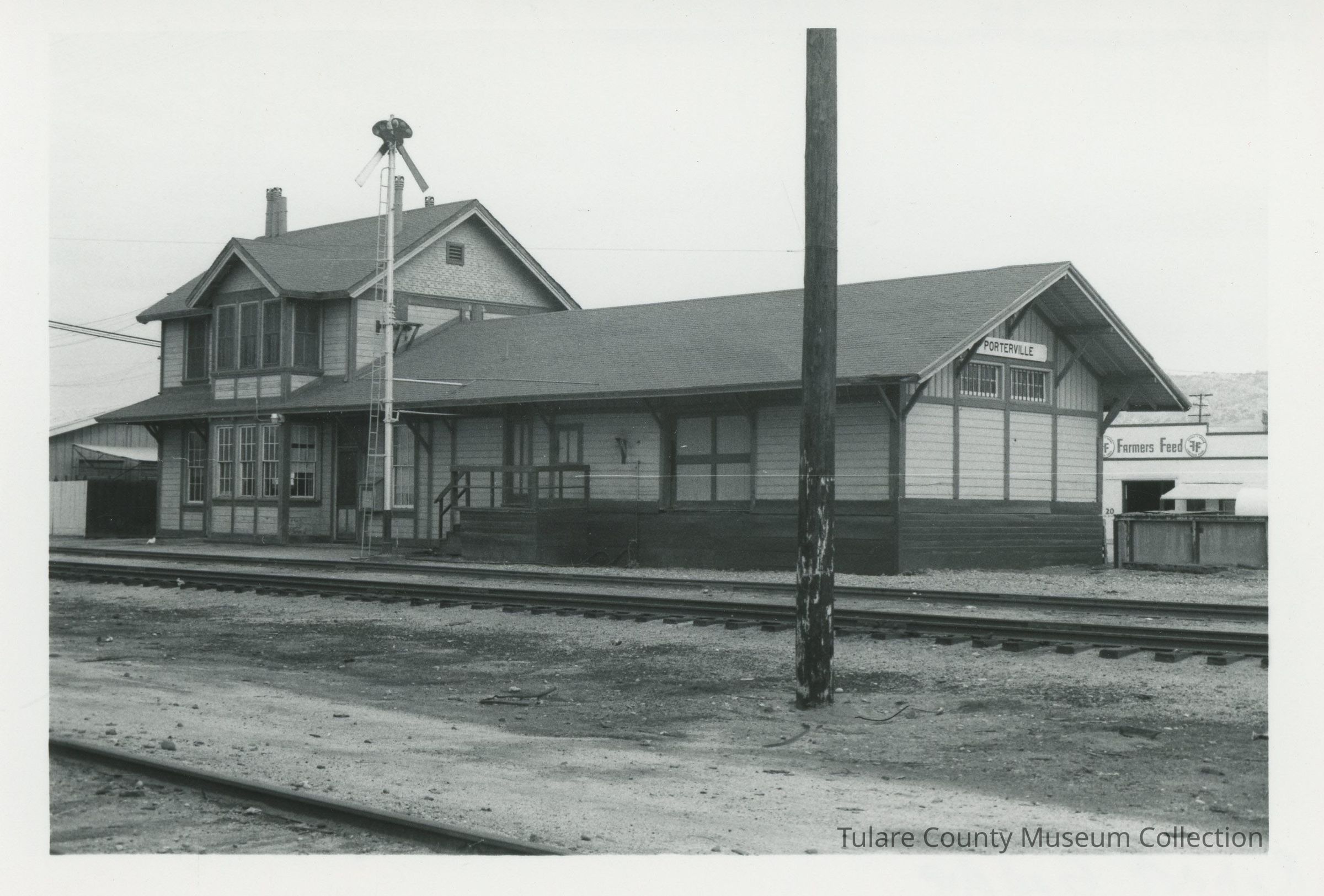This is the west side and south end of the Porterville freight depot. THe freight room is at the south end of the building. The agent's office was located at the north end. The second floor at one time containted an apartment for the agent and his family. Note the train order signal mast. At the time this photograph was taken Porterville was an open agency with a train order office. The main line of the Exeter branch is in the foreground. This view looks northeast.