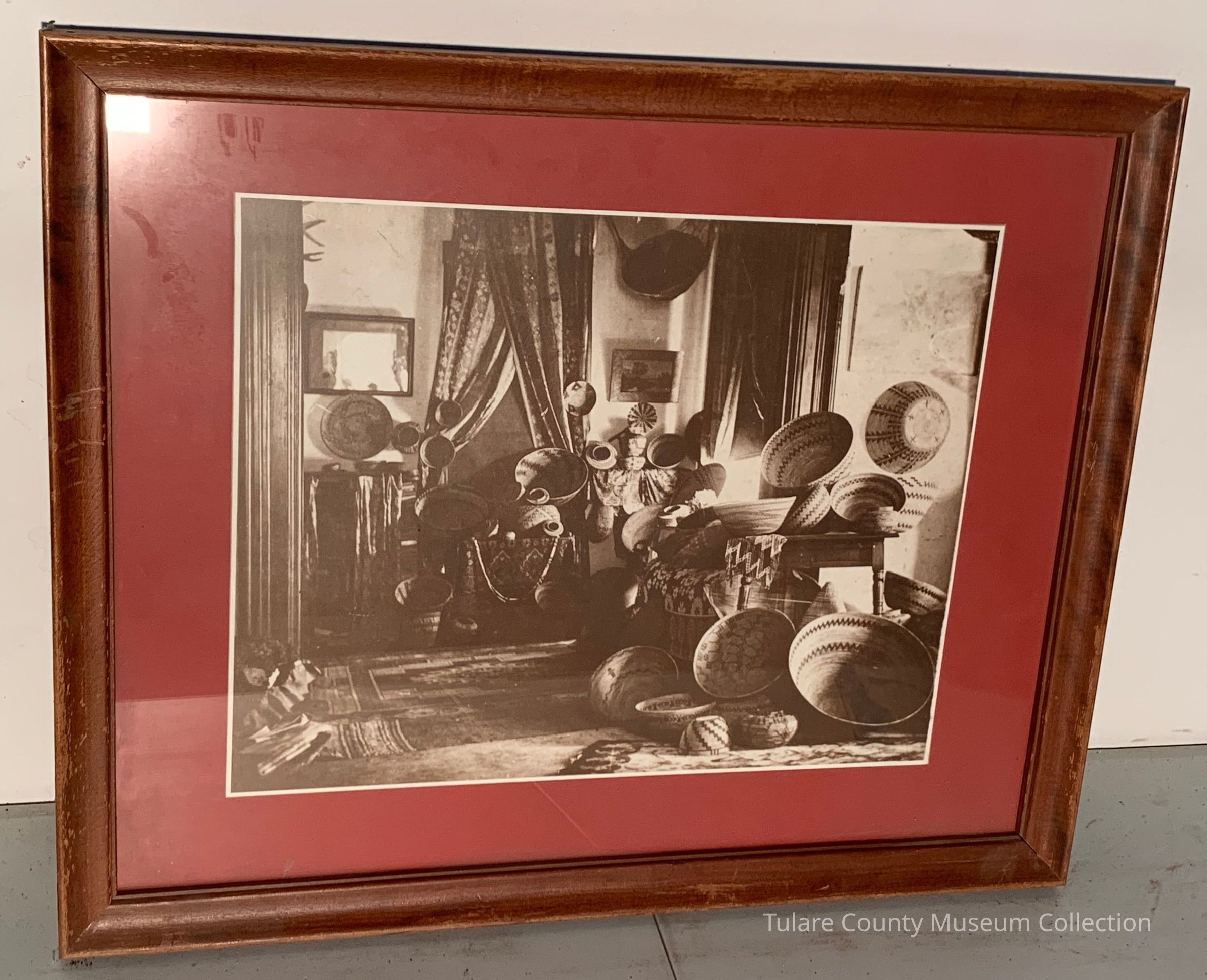 Picture of room filled with woven baskets, with white boarder and red background.