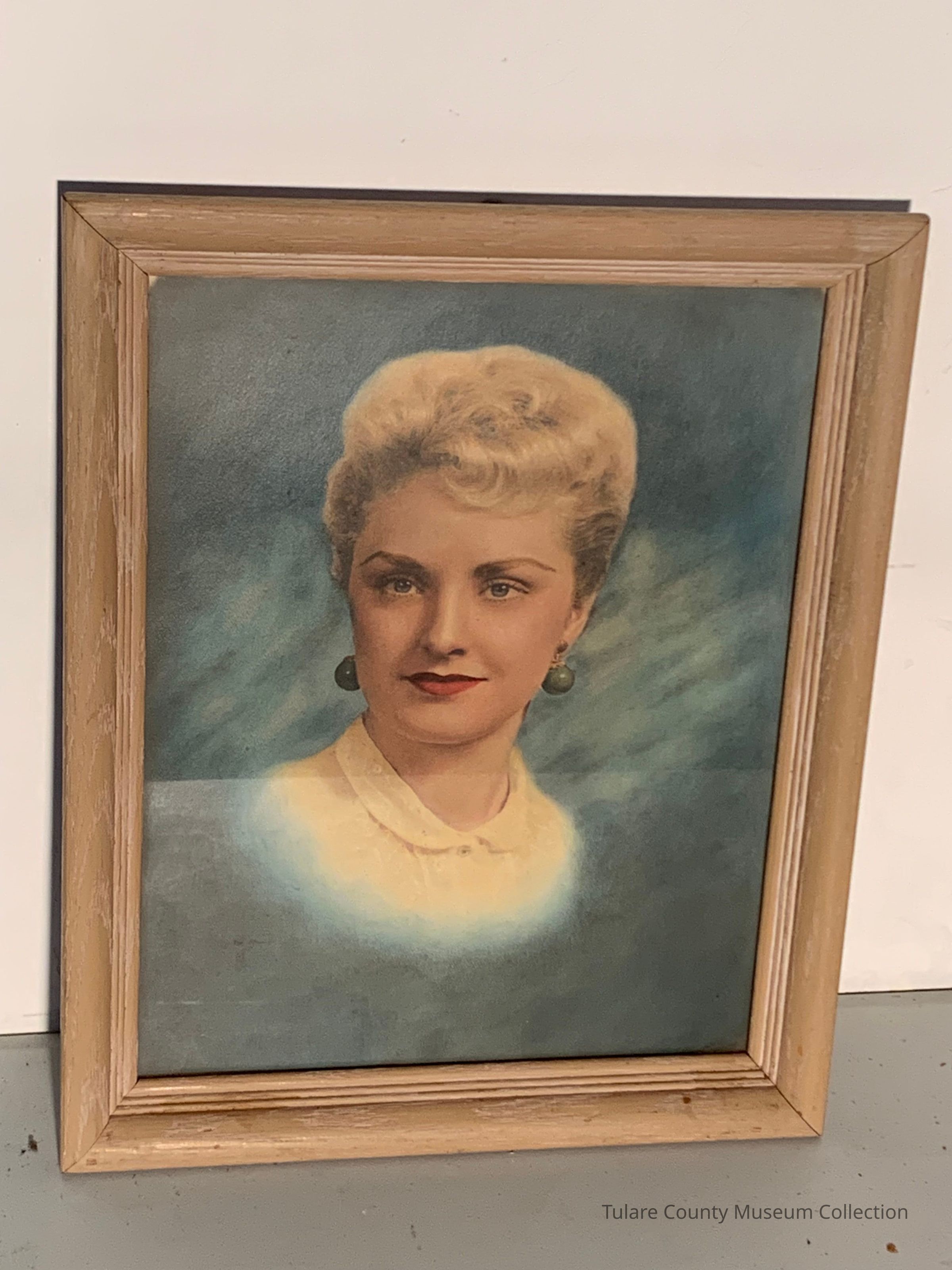 Colorized photo of blonde woman with green earrings, and yellow blouse. Framed.