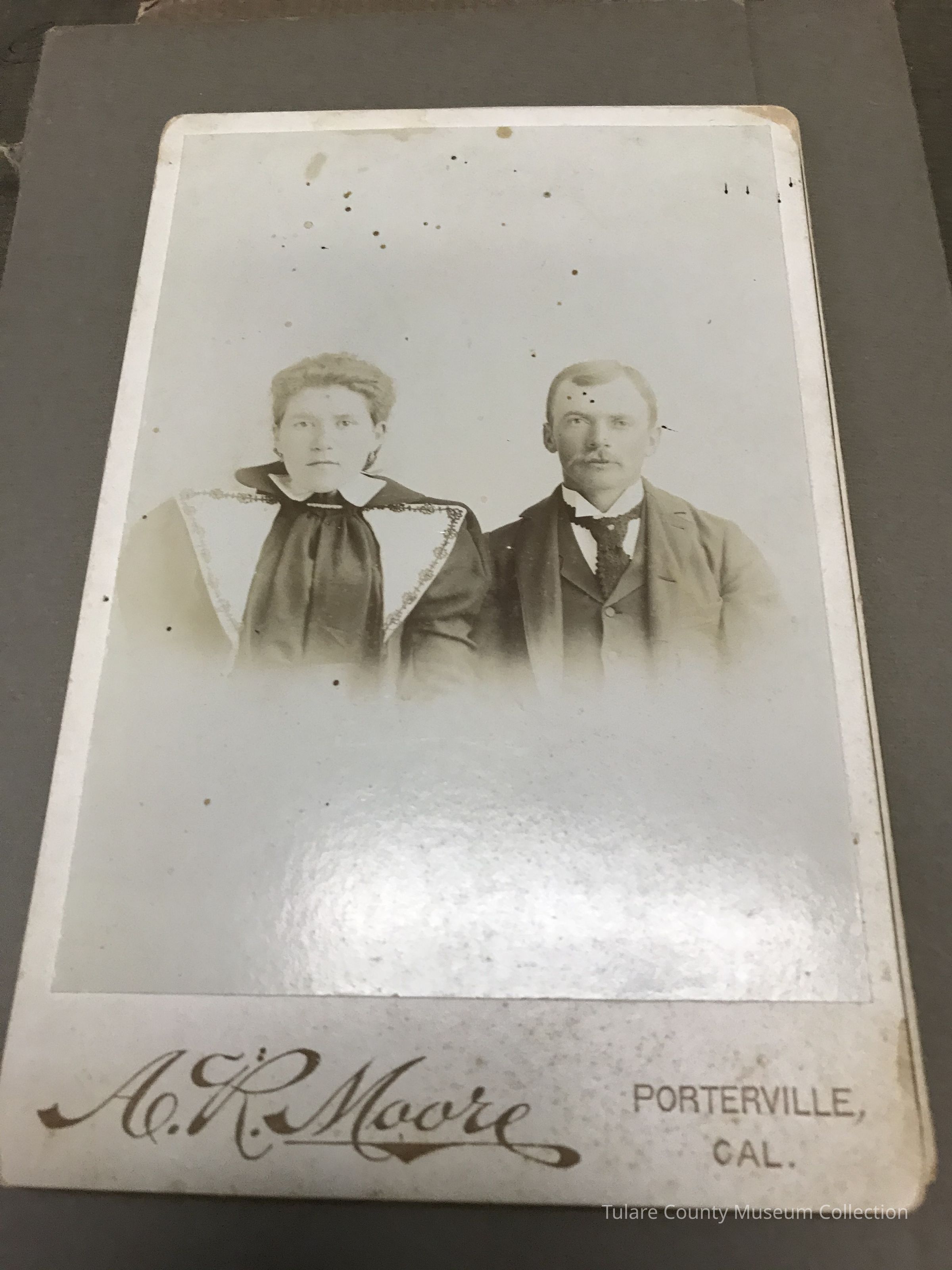3x5 black and white picture of Edith & Fred Gibson. Printed on cardboard by A. R. Moore of Porterville, CA.