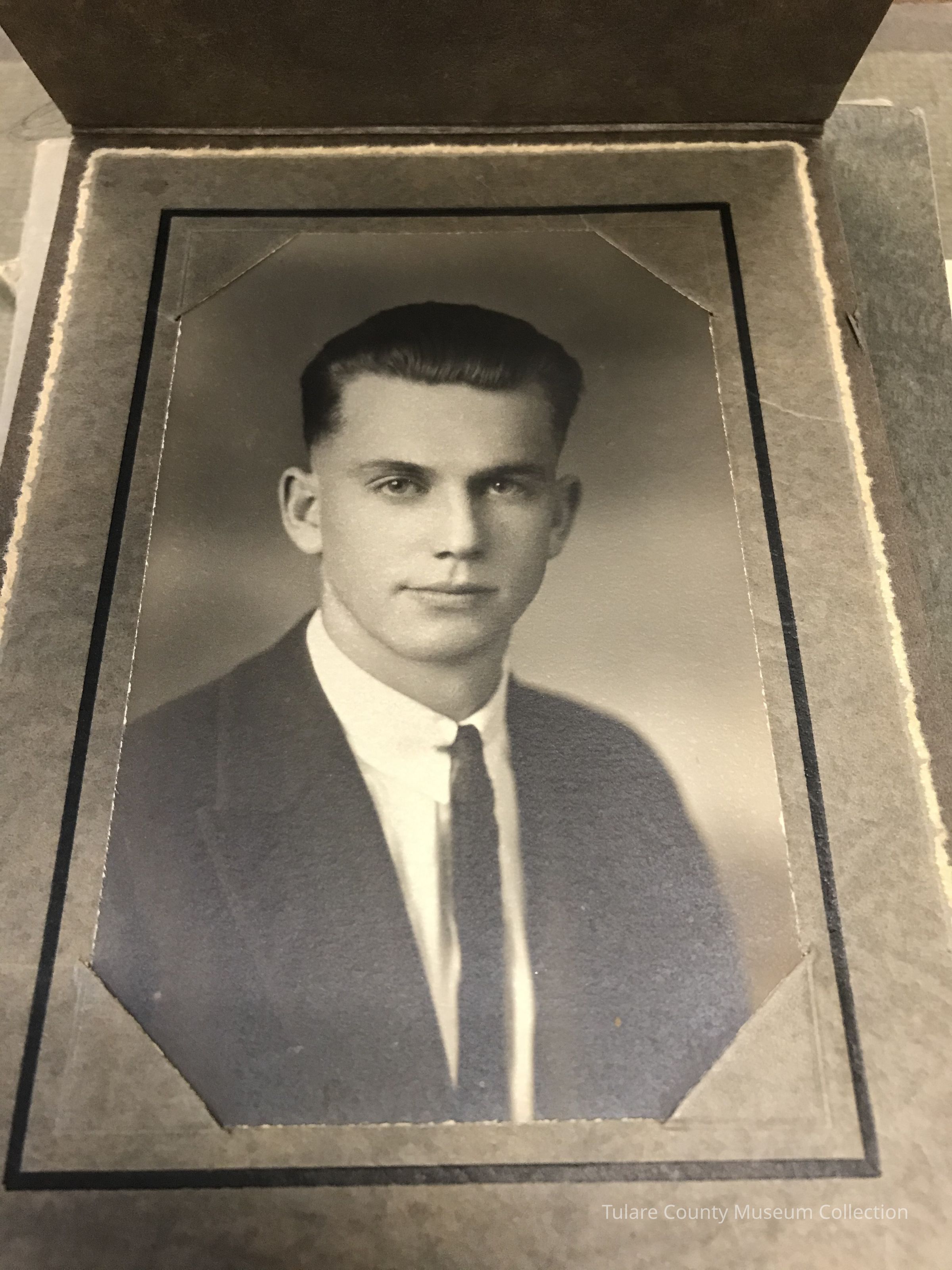 2x4 black and white picture of Ira Jones in a cardboard case. Printed by Hammond of Porterville, CA. Wearing dark suit with skinny dark tie.