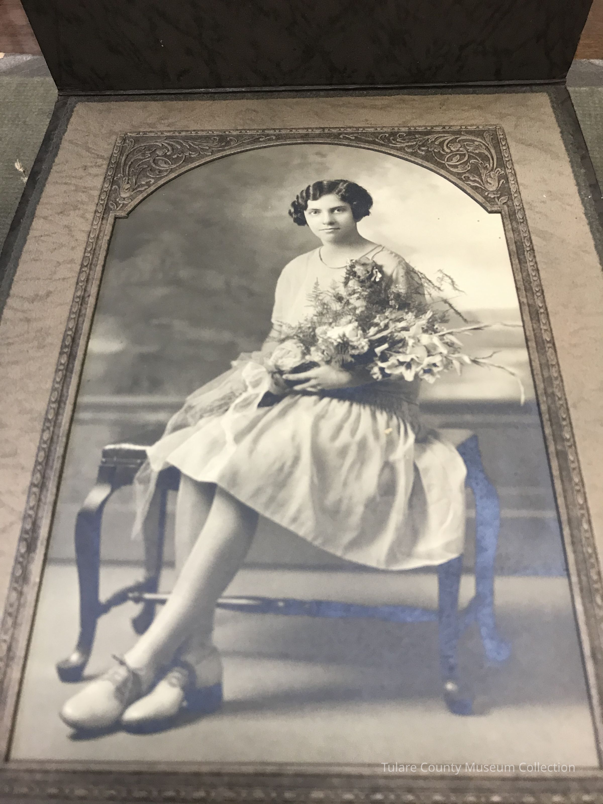 4x6 black and white picture of Vera Coulton in cardboard case. Printed by Hammond of Porterville, CA. Wearing a light colored dress, sitting and holding flowers.Lexicon