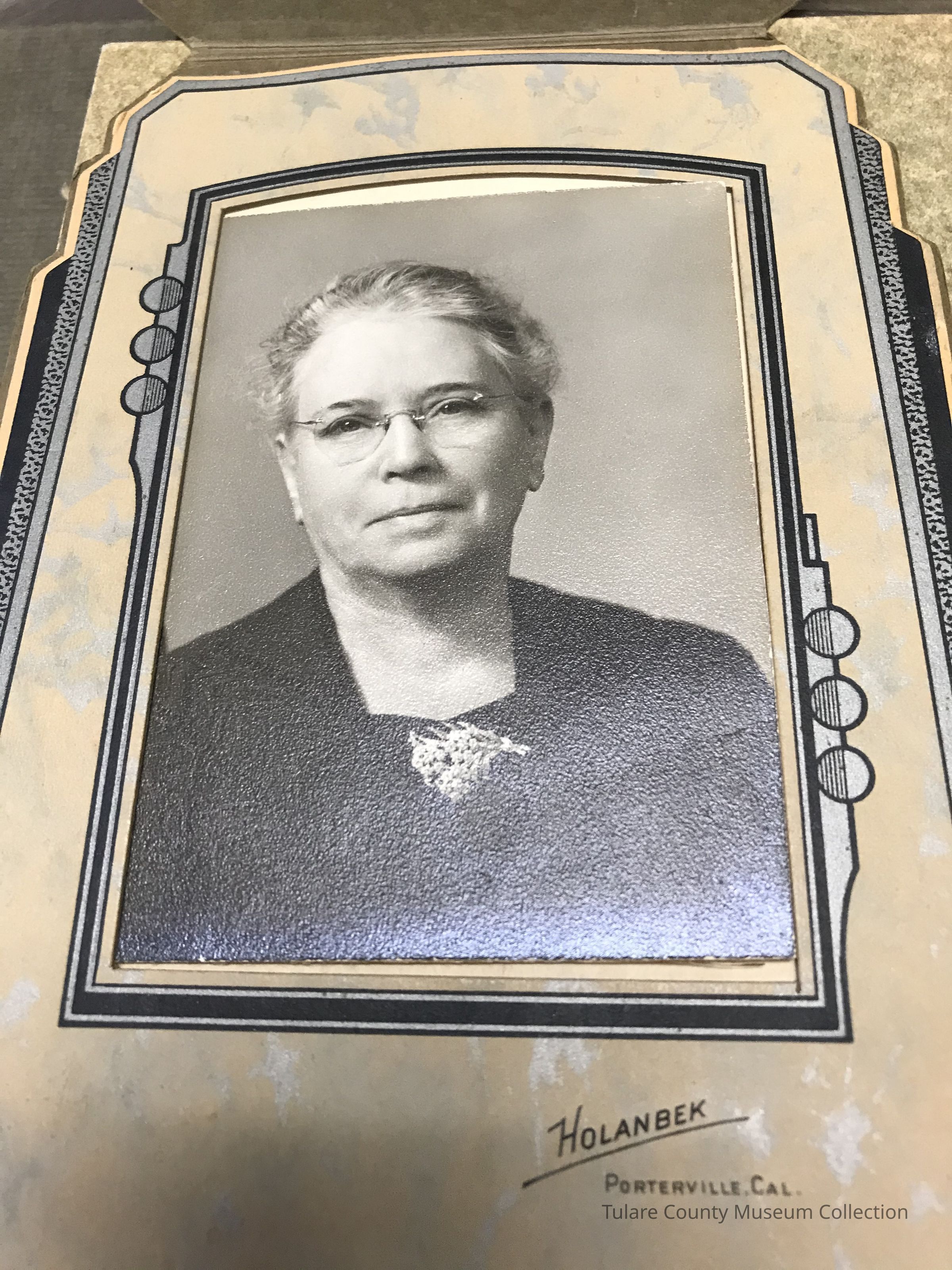 2x4 black and white picture of Annie Shoney in cardboard case. Printed by Holanbek of Porterville, CA. Wearing dark colored outfit with flower broach and glasses.