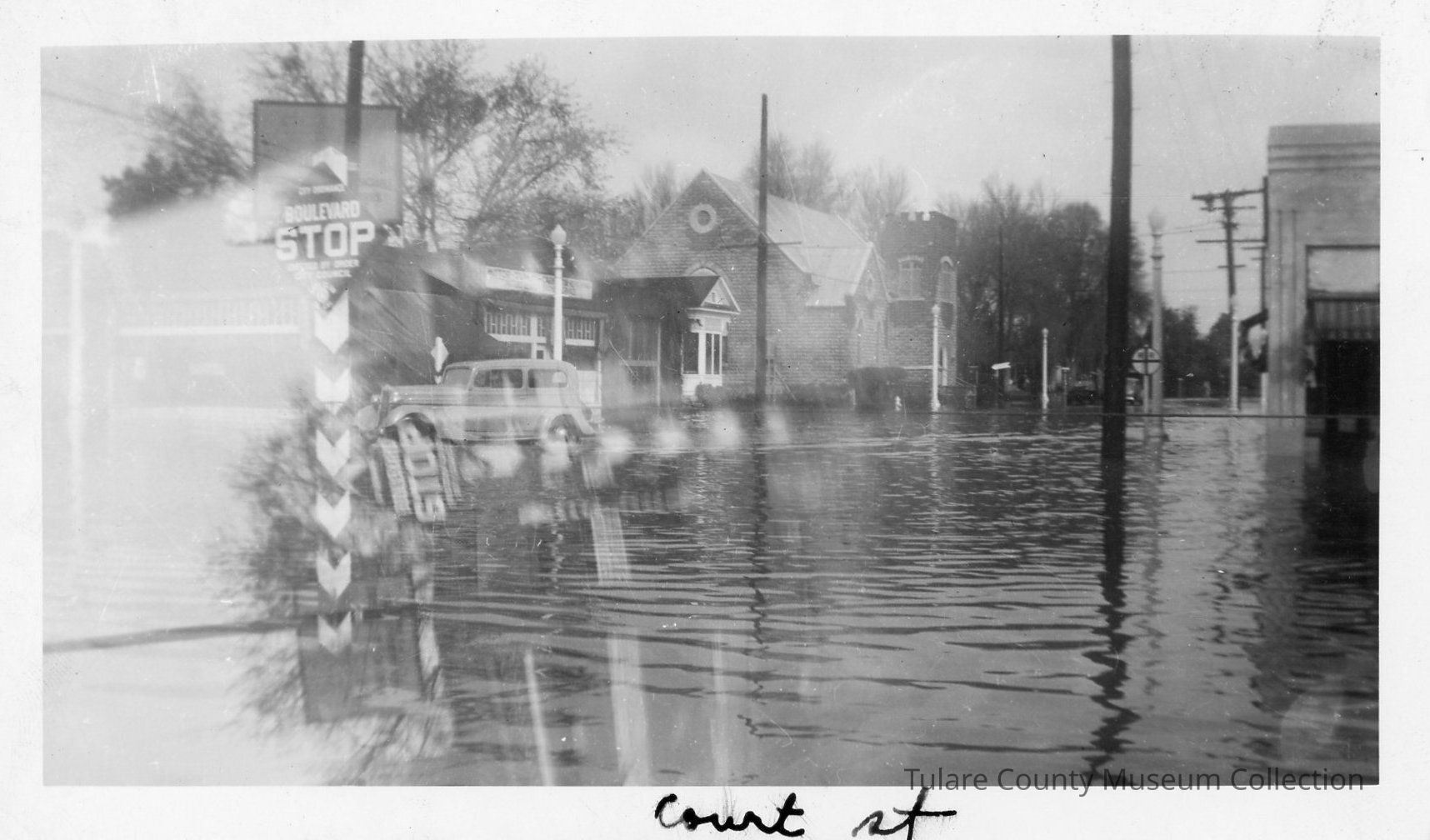 Black and white photo of Court Street during 1955 flood.