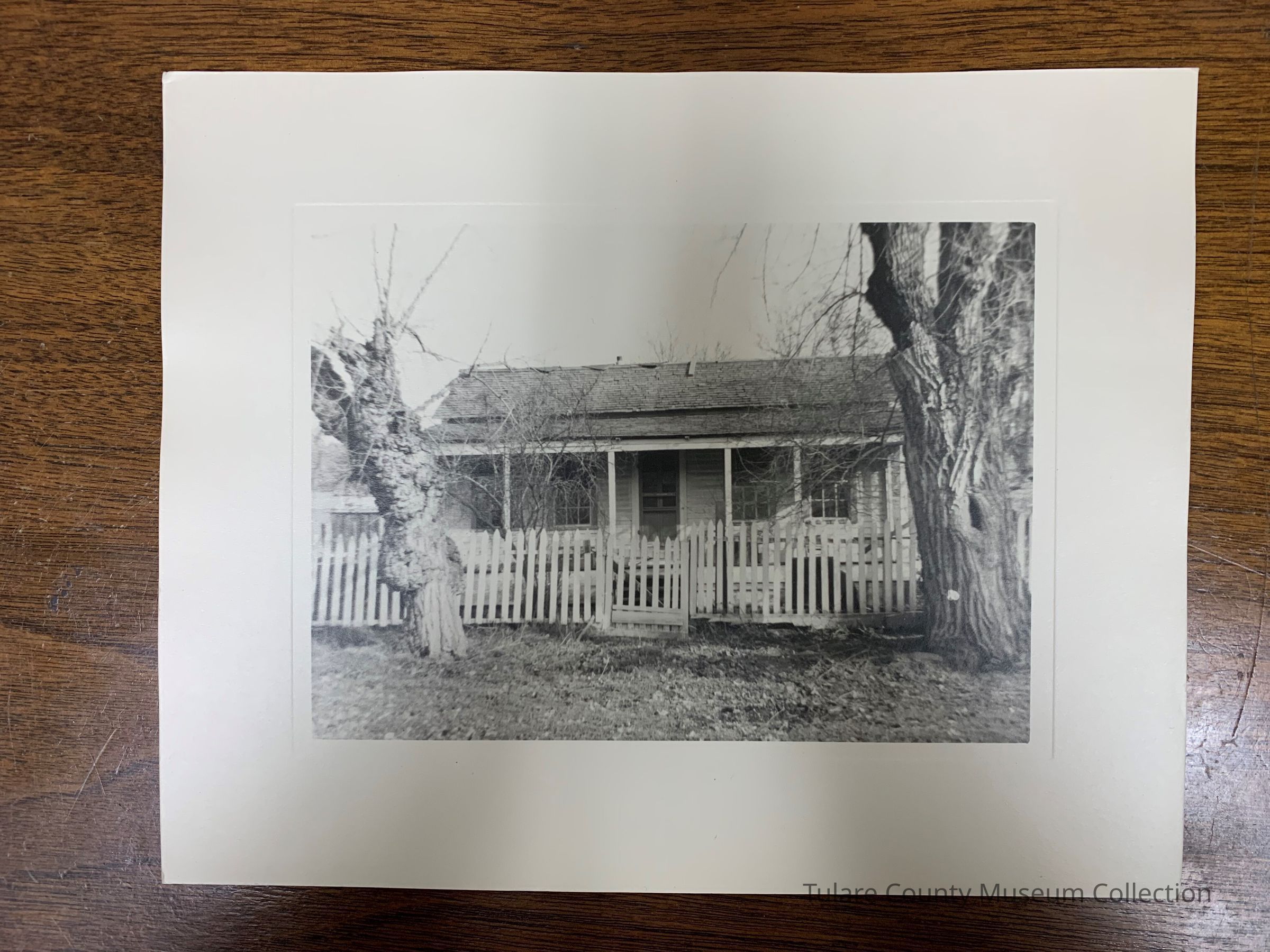 Black and white photo of unidentified house with two trees in front